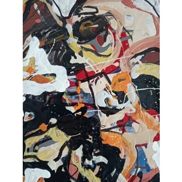 Dit ingelijst werk is gemaakt met acryl verf. lakverf, stift en houtskool op een linnen doek. De afmeting is 42 x 32 cm en is 3,5 cm dik (dit is inclusief passe partout en zwarte lijst). Het werk zelf is 29 x 20 cm. Rechtstreeks uit het atelier in Weert (NL).