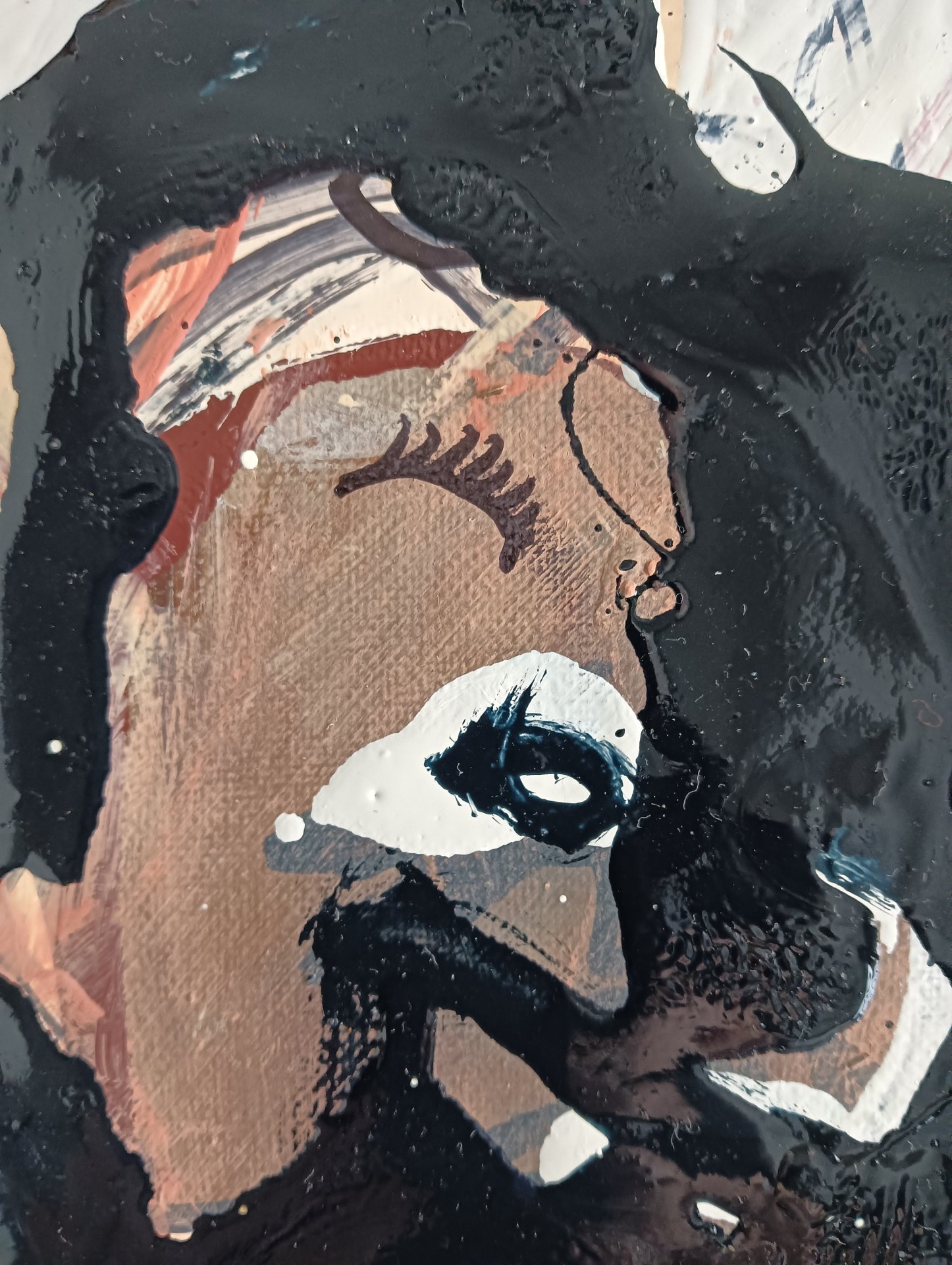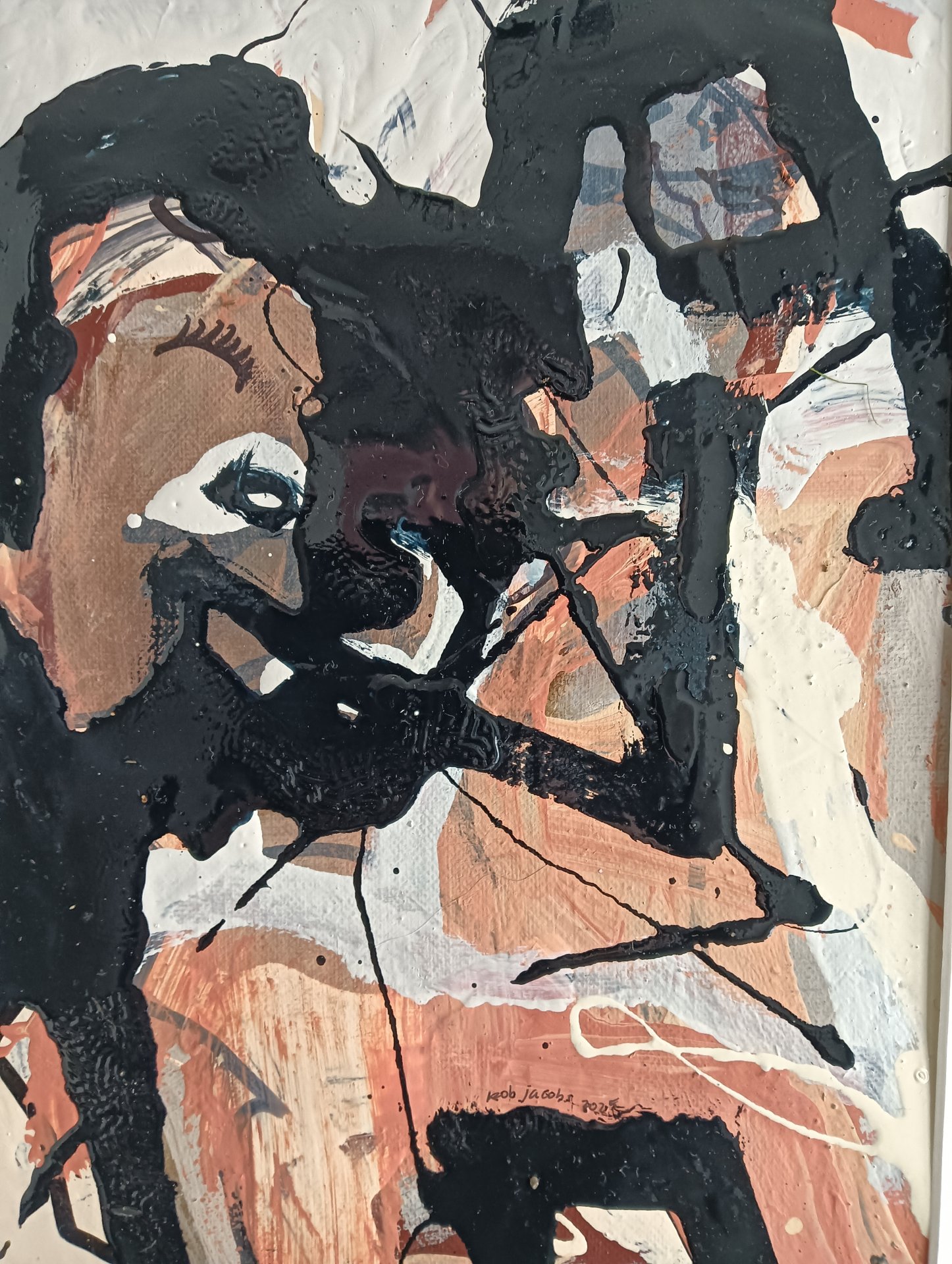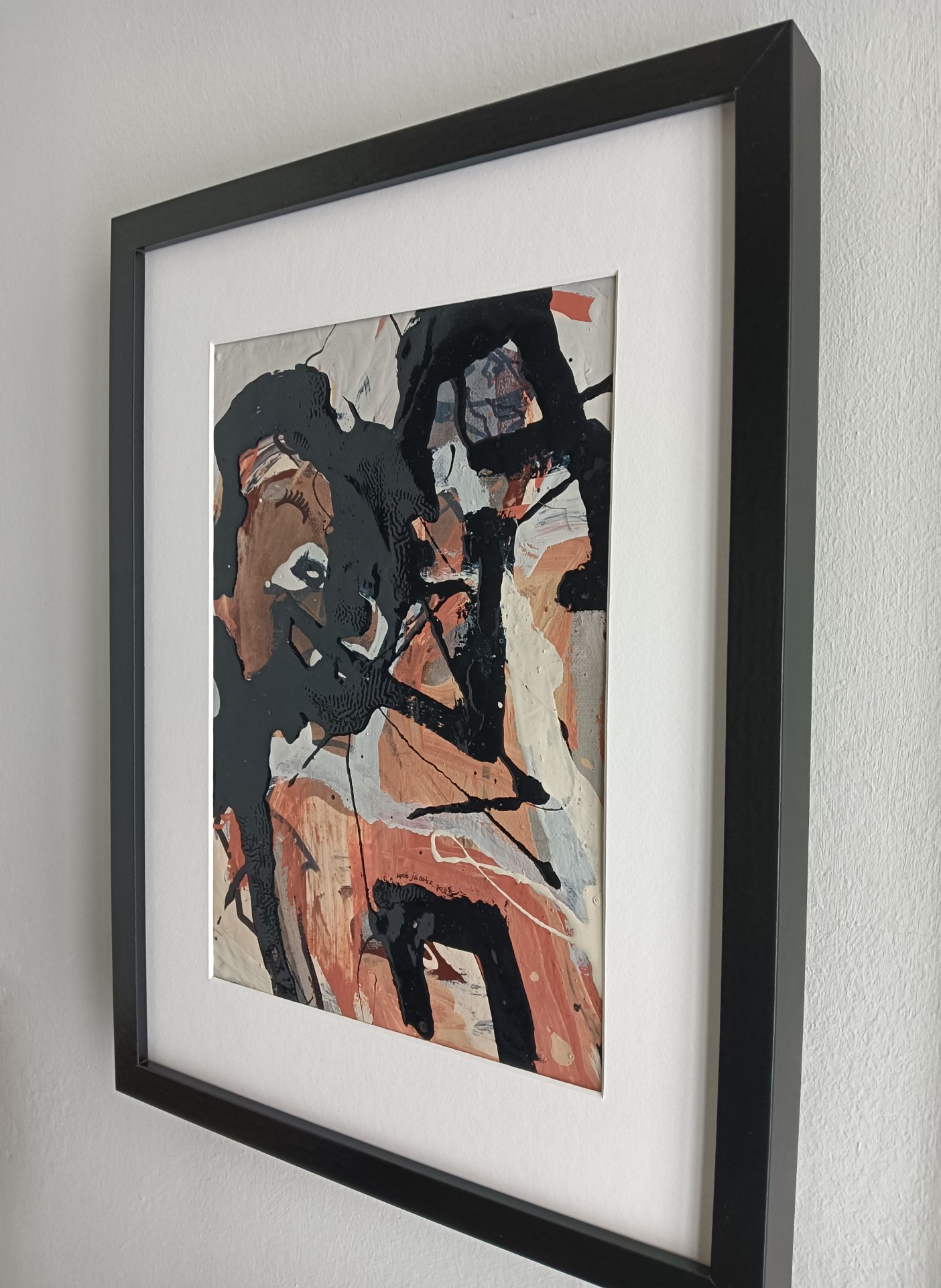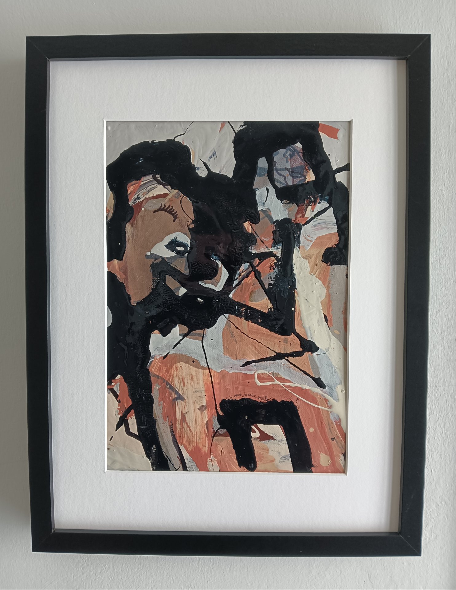 Dieses abstrakte Werk wurde mit Acrylfarbe, Lackfarbe und Marker auf einer Leinwand erstellt. Die Größe beträgt 42 x 32 cm und ist 3,5 cm dick (dies beinhaltet Passepartout und schwarzen Rahmen). Das Werk selbst ist 29 x 20 cm. Direkt aus dem Atelier in Weert (NL).