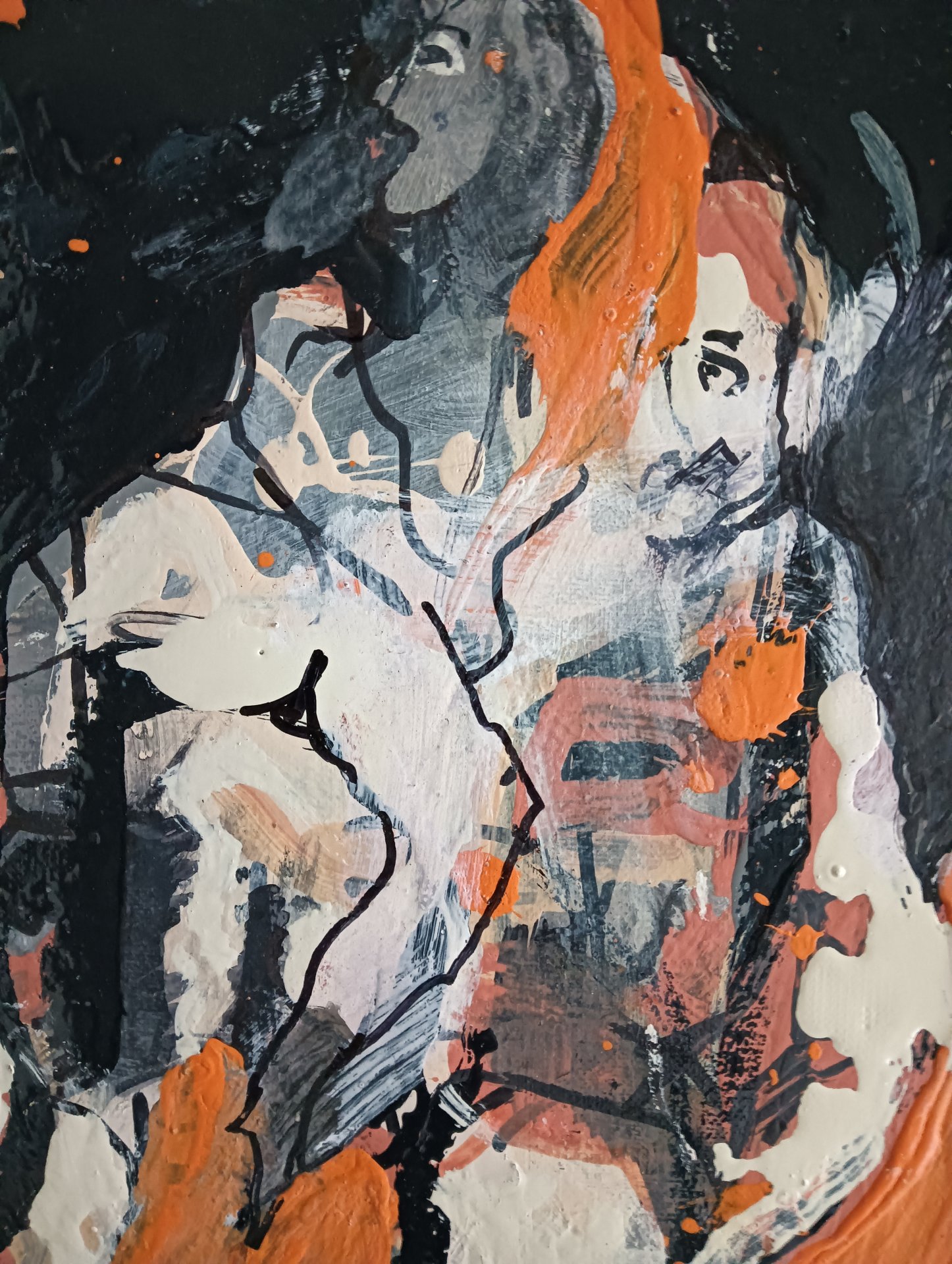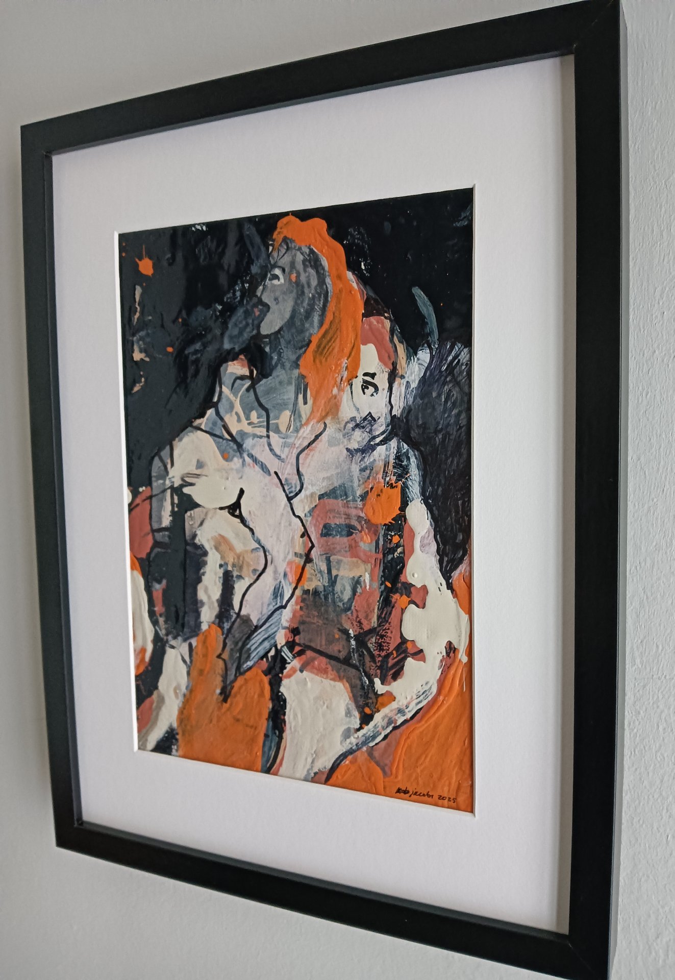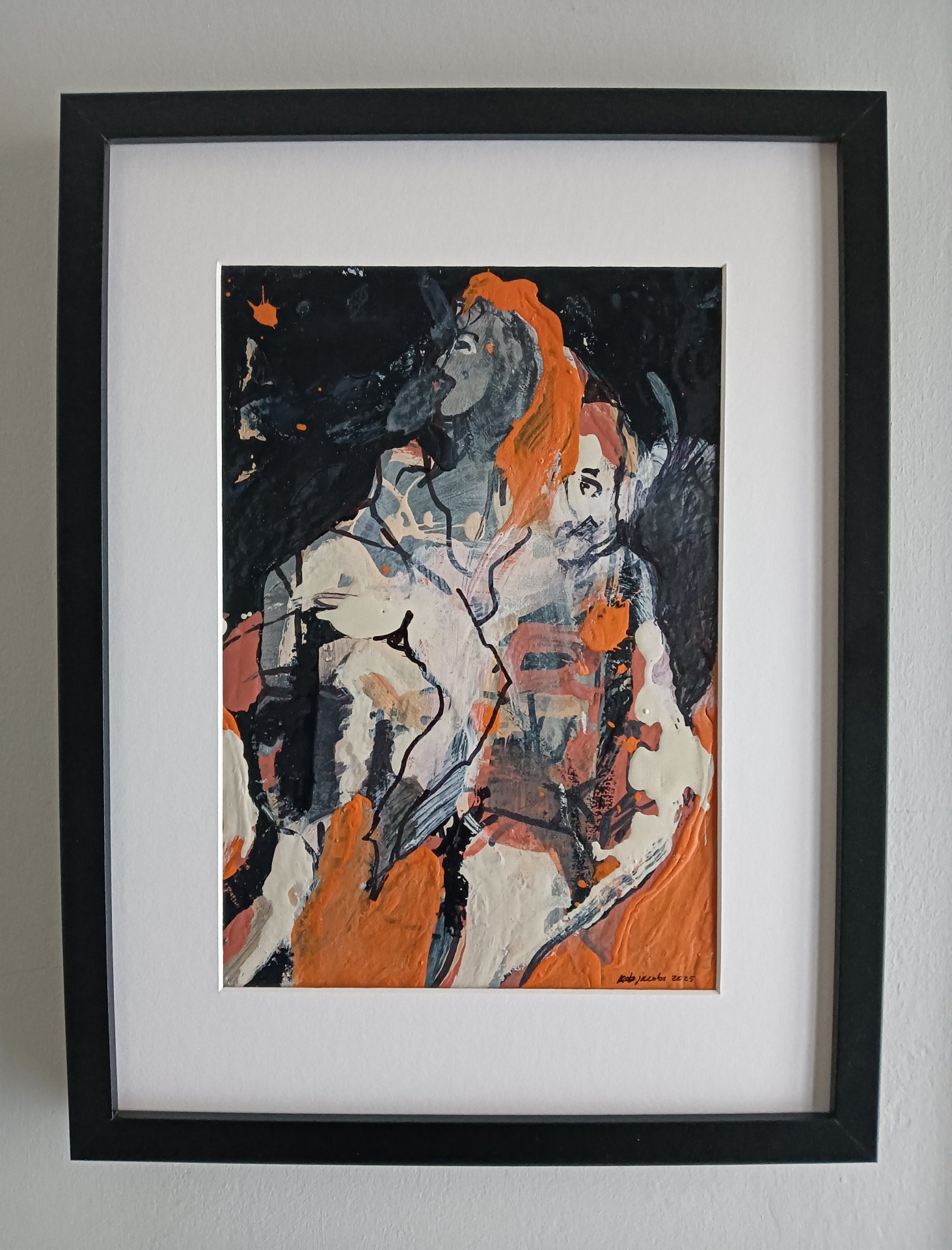 Dieses gerahmte expressive Werk wurde mit Acrylfarbe, Lackfarbe und Marker auf einer Leinwand erstellt. Die Abmessungen betragen 42 x 32 cm und sind 3,5 cm dick (dies beinhaltet Passepartout und schwarzen Rahmen). Das Werk selbst ist 29 x 20 cm. Direkt aus dem Atelier in Weert (NL).