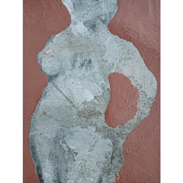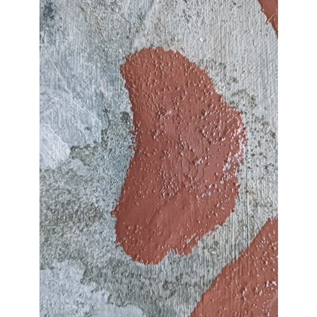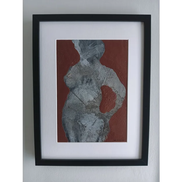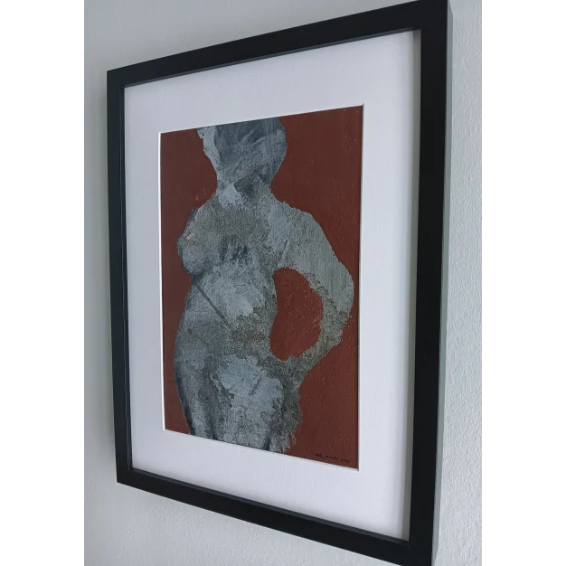 This framed painting is made with acrylic paint, lacquer paint, and charcoal on a linen canvas. Furthermore, sand and pieces of leftover paint are incorporated. The dimensions are 42 x 32 cm and it is 3.5 cm thick (this includes the mat and black frame). The work itself is 29 x 20 cm. Dated and hand-signed in 2025. Directly from the studio in Weert (NL).
