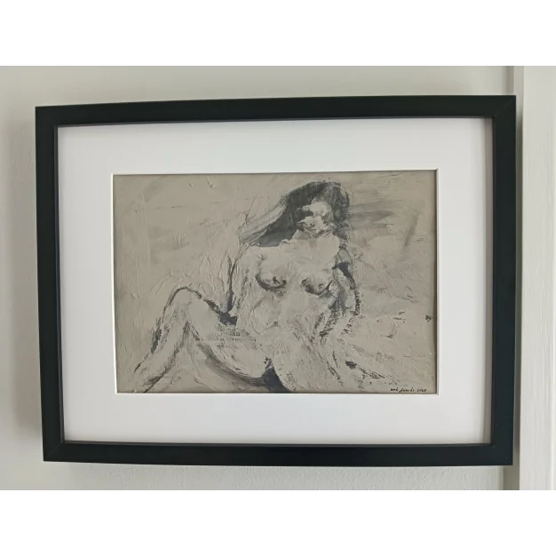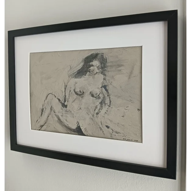 This framed work is made with acrylic paint and marker on cardboard. The dimensions are 42 x 32 cm and it is 3.5 cm thick (this includes passe-partout and black frame). The work itself is 29 x 20 cm. Dated and hand-signed in 2025. Directly from the studio in Weert (NL).
