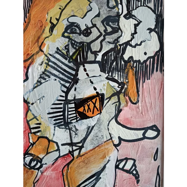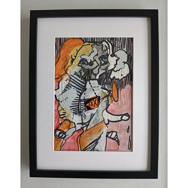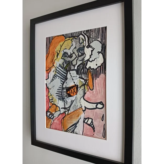 Dit ingelijst werk is gemaakt met acryl verf, lakverf, houtskool en stift op papier. De afmeting is 42 x 32 cm en is 3,5 cm dik (dit is inclusief passe partout en zwarte lijst). Het werk zelf is 29 x 20 cm. Rechtstreeks uit het atelier in Weert (NL).