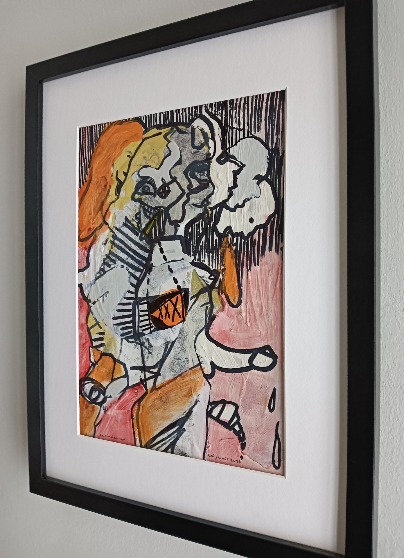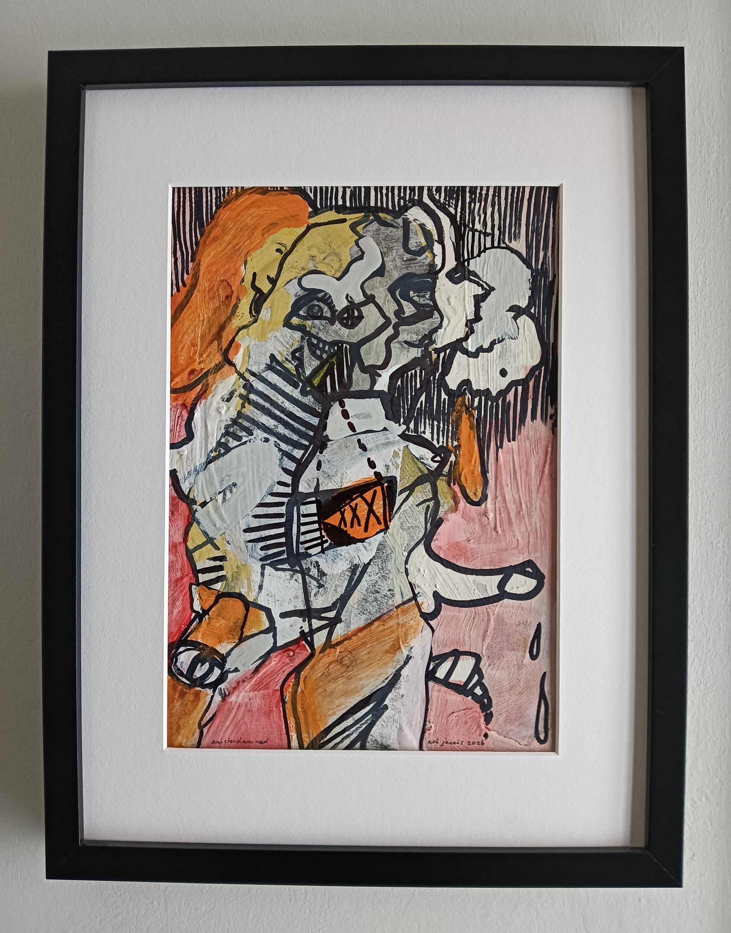 Dit ingelijst werk is gemaakt met acryl verf, lakverf, houtskool en stift op papier. De afmeting is 42 x 32 cm en is 3,5 cm dik (dit is inclusief passe partout en zwarte lijst). Het werk zelf is 29 x 20 cm. Rechtstreeks uit het atelier in Weert (NL).