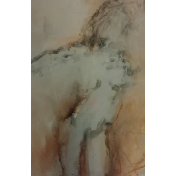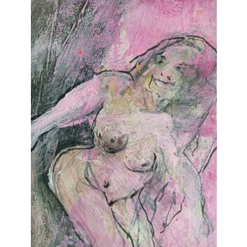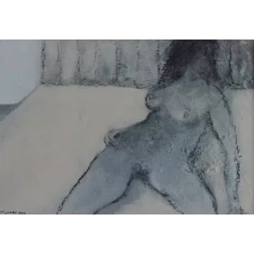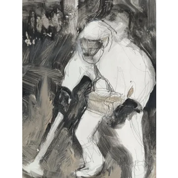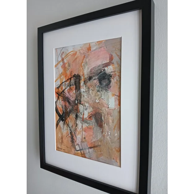 This framed work is made with acrylic paint, marker, and charcoal on cardboard. The dimensions are 42 x 32 cm and it is 3.5 cm thick (this includes the mat and black frame). The work itself is 29 x 20 cm. Dated and hand-signed in 2025. Directly from the artist's studio.