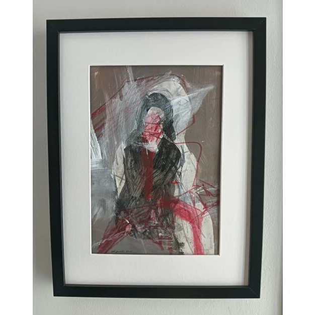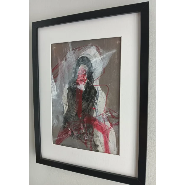 This framed painting is made with acrylic paint, pencil, marker, and oil pastel on cardboard. The dimensions are 42 x 32 cm and it is 3.5 cm thick (this includes the mat and black frame). The work itself is 29 x 20 cm. Dated and hand-signed in 2025. Directly from the studio in Weert (NL).