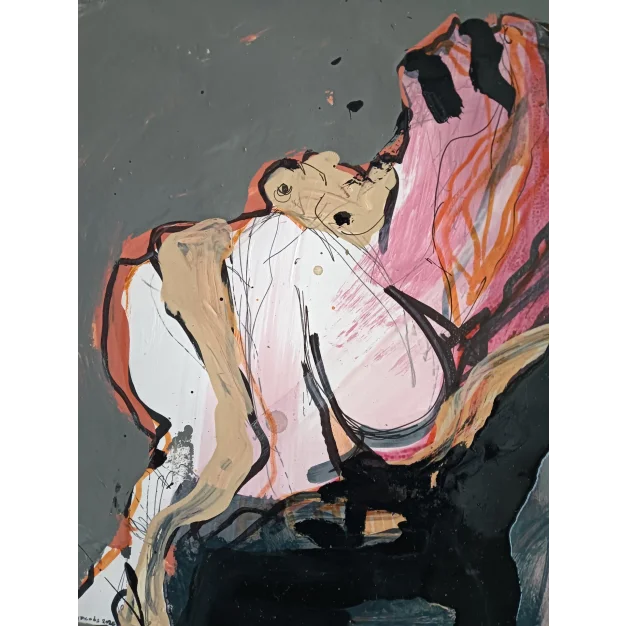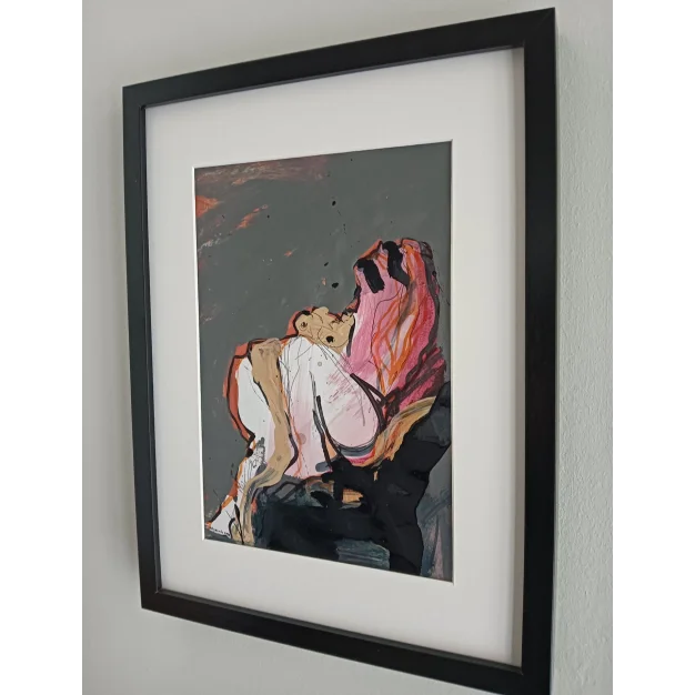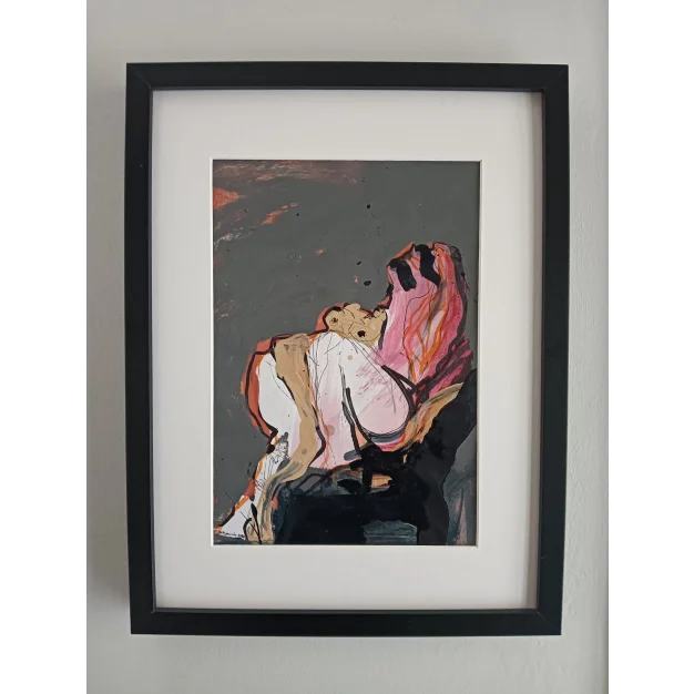 This framed work is made with acrylic paint, lacquer paint, and marker on paper. The dimensions are 42 x 32 cm and it is 3.5 cm thick (this includes passe-partout and black frame). The work itself is 29 x 20 cm. Dated and hand-signed in 2025. Directly from the studio in Weert (NL).