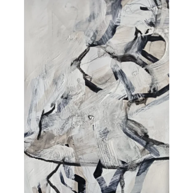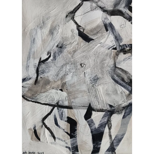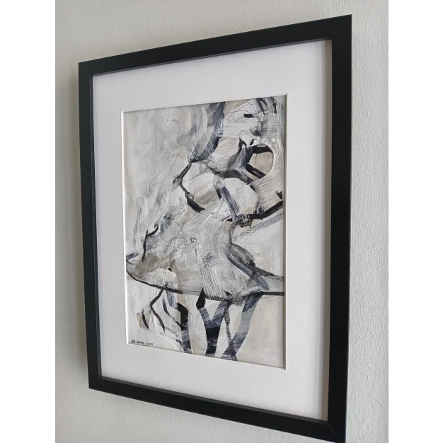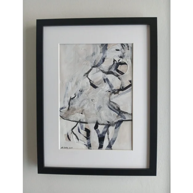 This framed work is made with acrylic paint, charcoal, marker, and pencil on cardboard. The dimensions are 42 x 32 cm and it is 3.5 cm thick (this includes the mat and black frame). The work itself is 29 x 20 cm. Dated and hand-signed in 2025. Directly from the artist's studio.