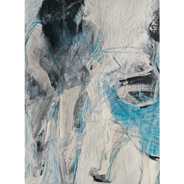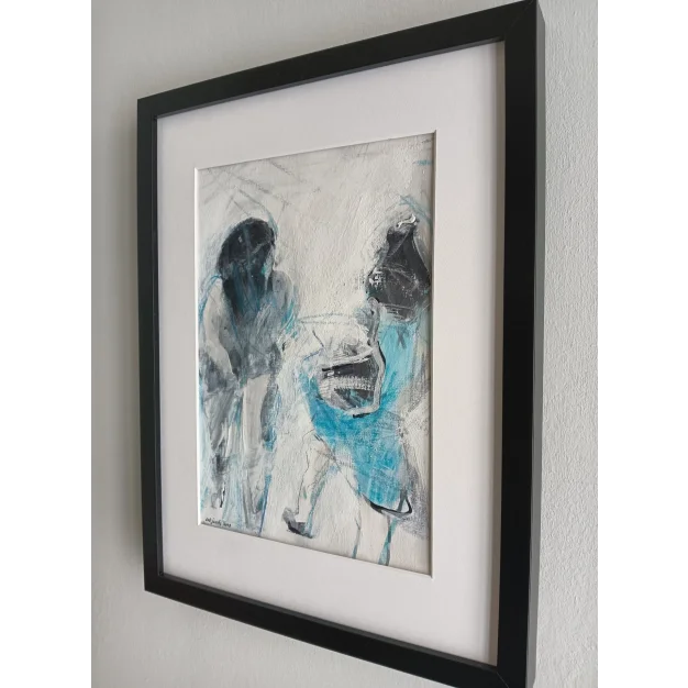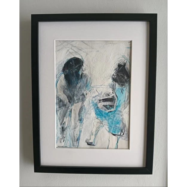 This framed work is made with acrylic paint, marker, oil pastel, and charcoal on linen paper. The dimensions are 42 x 32 cm and it is 3.5 cm thick (this includes the mat and black frame). The work itself is 29 x 20 cm. Dated and hand-signed in 2025. Directly from the artist's studio.