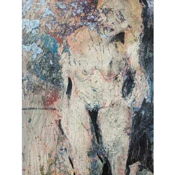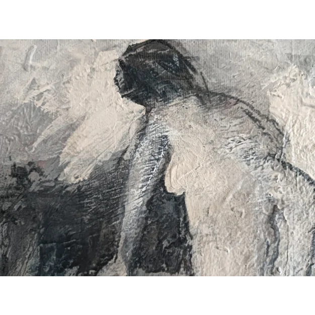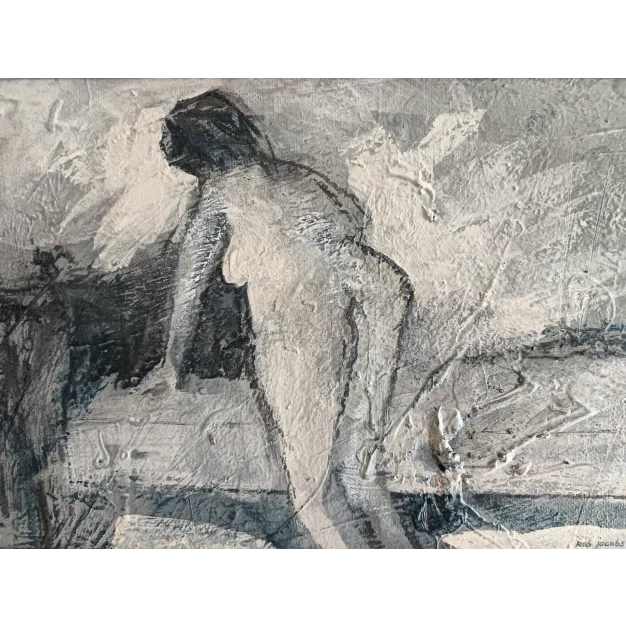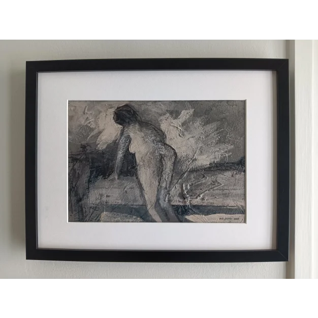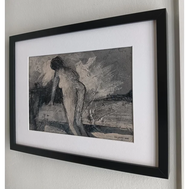 This framed work is made with acrylic paint and charcoal on a canvas. The dimensions are 42 x 32 cm and it is 3.5 cm thick (this includes passe partout and black frame). The work itself is 30 x 20 cm. Dated and hand-signed in 2026. Directly from the studio in Weert (NL).