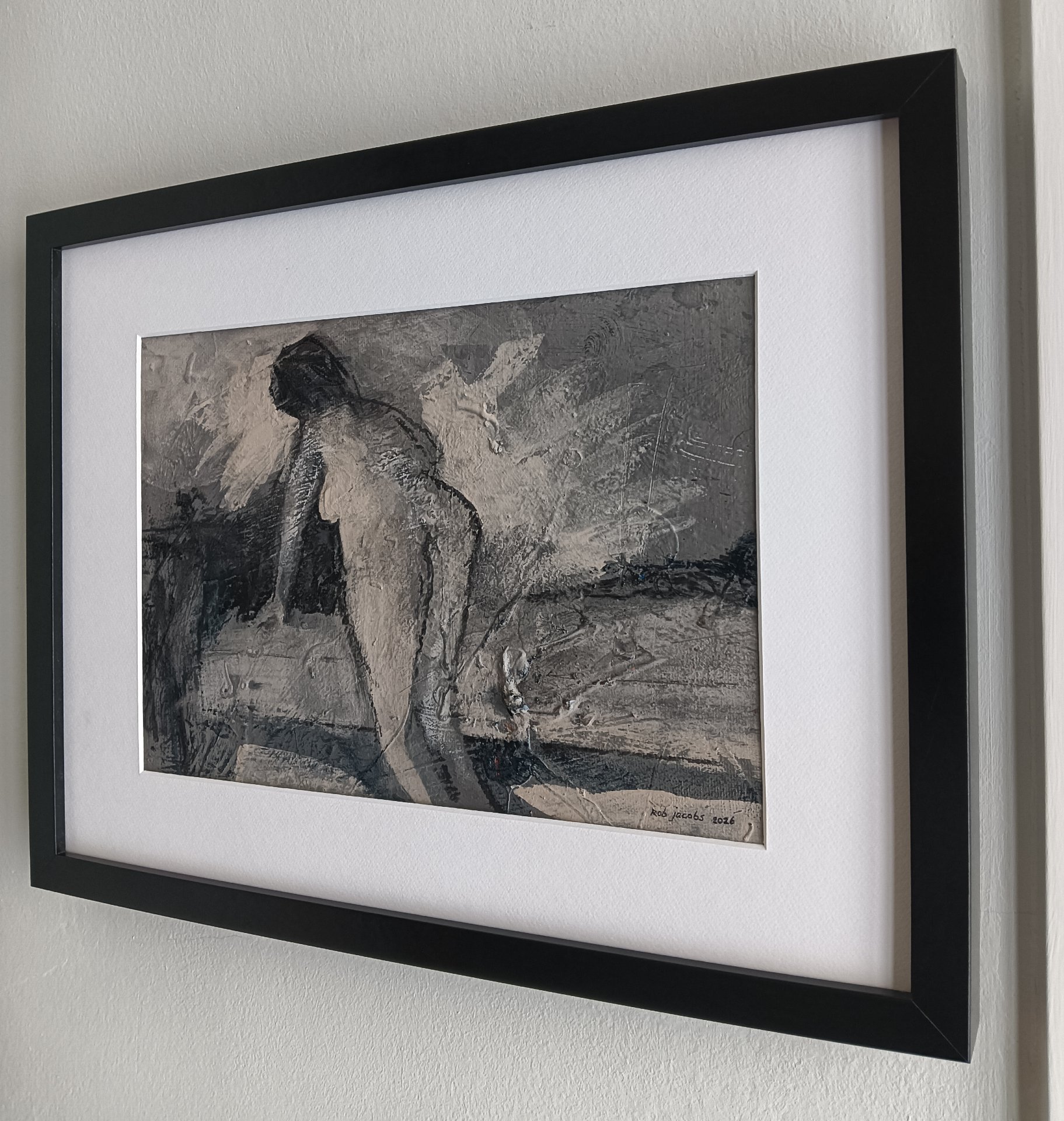 This framed work is made with acrylic paint and charcoal on a canvas. The dimensions are 42 x 32 cm and it is 3.5 cm thick (this includes passe partout and black frame). The work itself is 30 x 20 cm. Dated and hand-signed in 2026. Directly from the studio in Weert (NL).