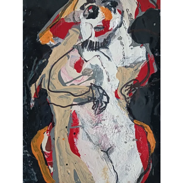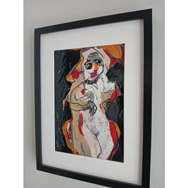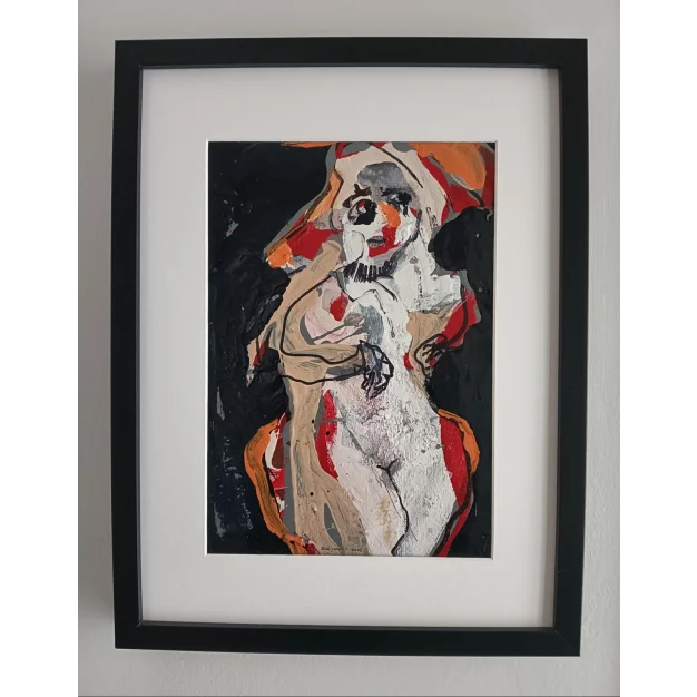 This framed work is made with acrylic paint, lacquer paint, and marker on linen canvas. The dimensions are 42 x 32 cm and it is 3.5 cm thick (this includes the passe-partout and black frame). The work itself is 29 x 20 cm. Dated and hand-signed in 2025. Directly from the studio in Weert (NL).