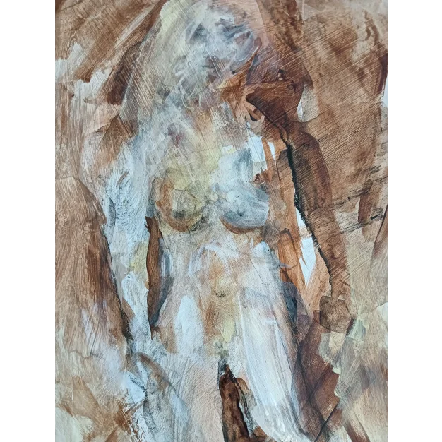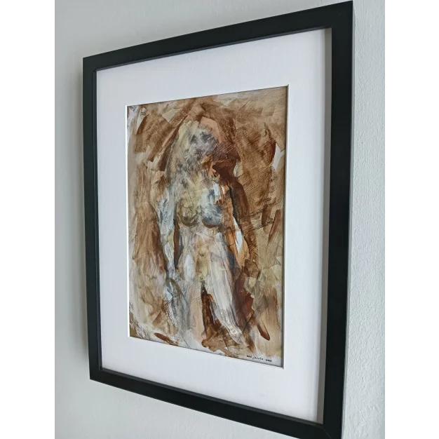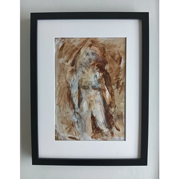 Dit ingelijst werk is gemaakt met acryl verf en houtskool op papier. De afmeting is 42 x 32 cm en is 3,5 cm dik (dit is inclusief passe partout en zwarte lijst). Het werk zelf is 29 x 20 cm. Gedateerd en hand gesigneerd in 2026. Rechtstreeks uit het atelier in Weert (NL).