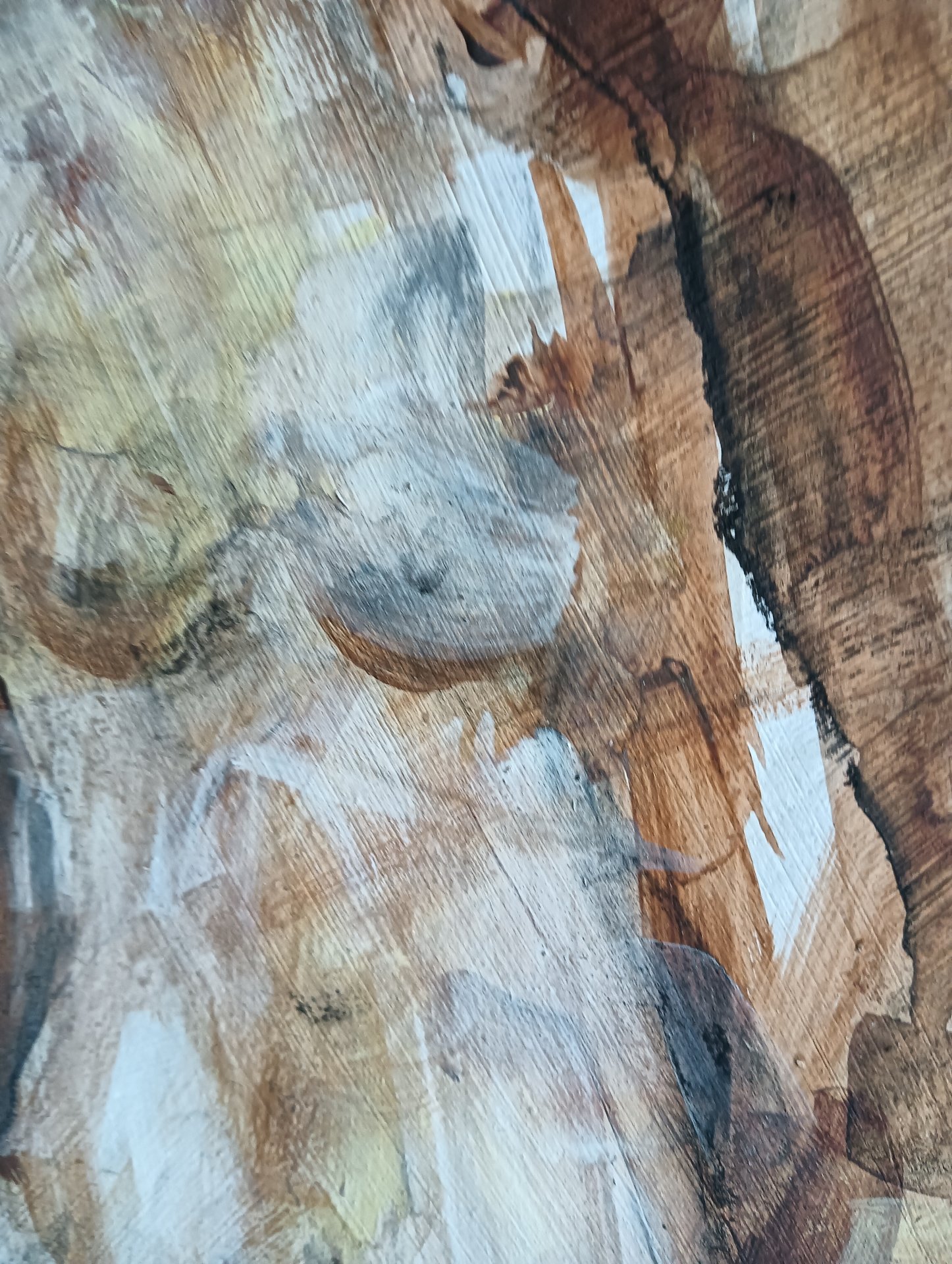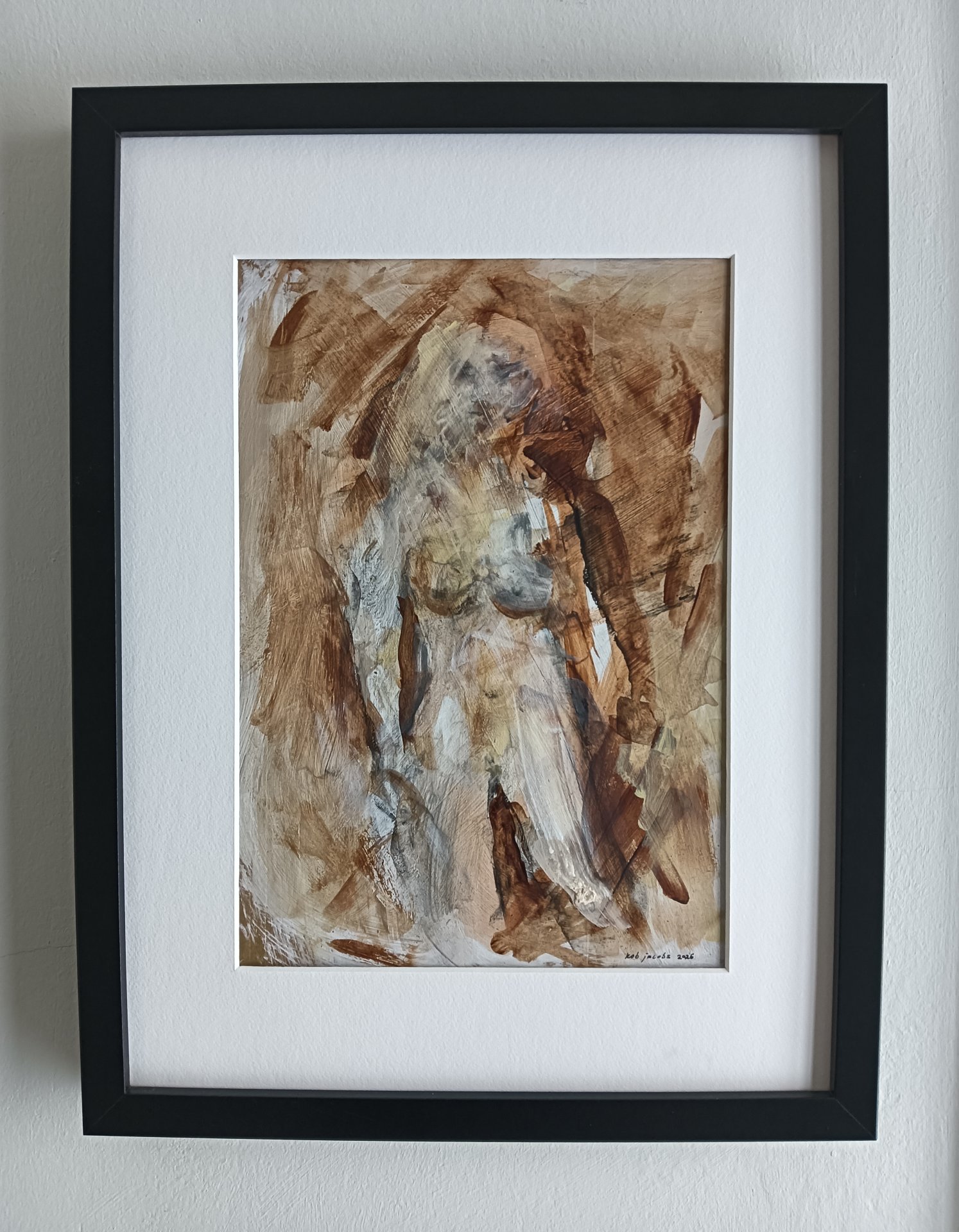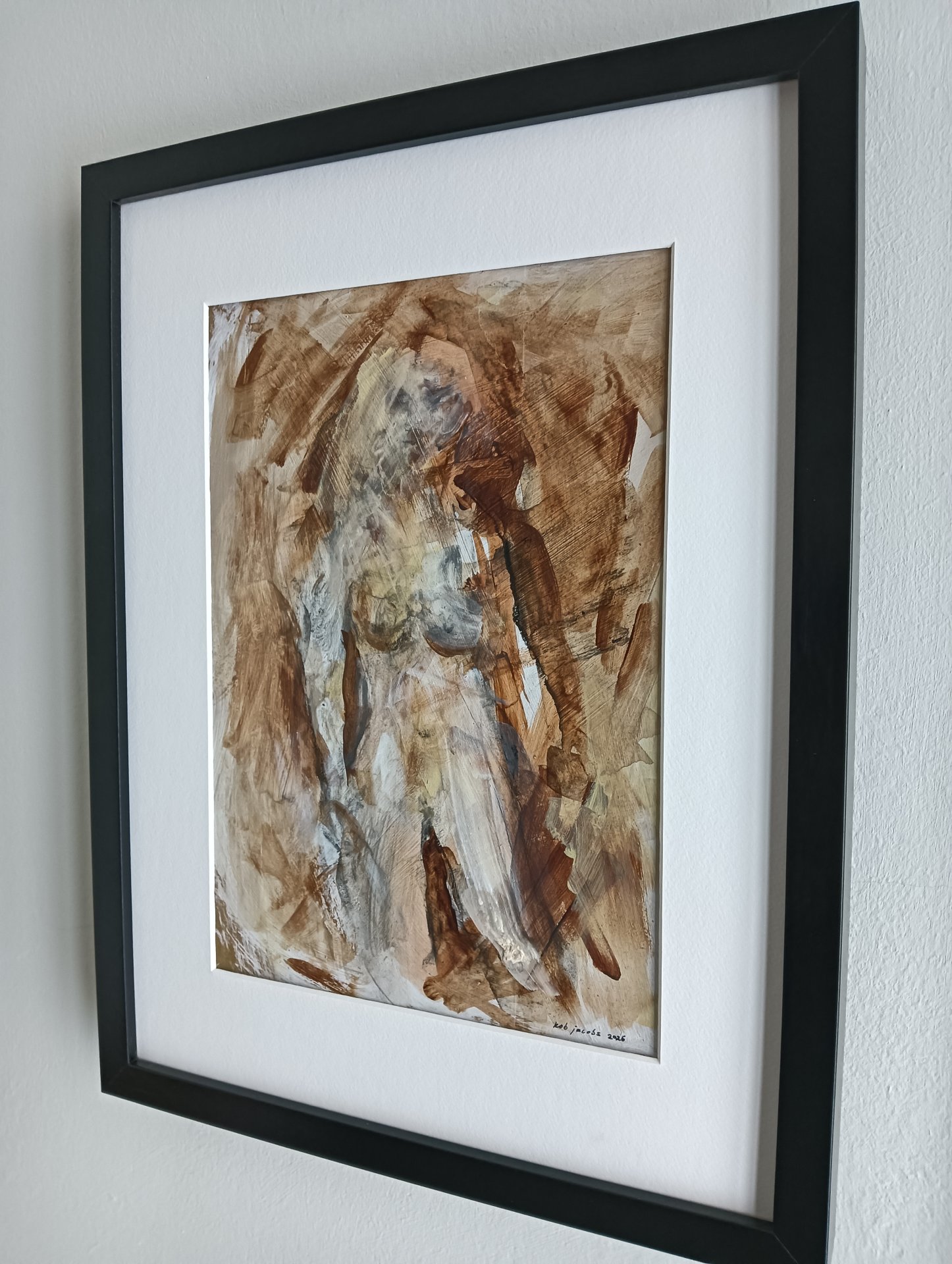 Dit ingelijst werk is gemaakt met acryl verf en houtskool op papier. De afmeting is 42 x 32 cm en is 3,5 cm dik (dit is inclusief passe partout en zwarte lijst). Het werk zelf is 29 x 20 cm. Gedateerd en hand gesigneerd in 2026. Rechtstreeks uit het atelier in Weert (NL).