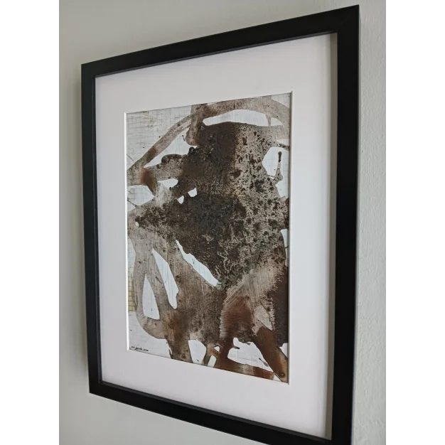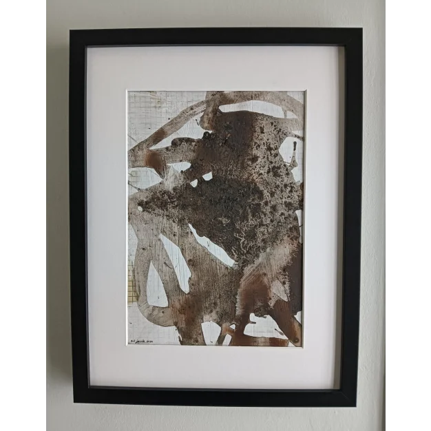 This framed work is made with acrylic paint and lacquer on pendaflex paper. The dimensions are 42 x 32 cm and it is 3.5 cm thick (this includes the passe-partout and black frame). The work itself is 29 x 20 cm. Dated and hand-signed in 2025. Directly from the studio in Weert (NL).