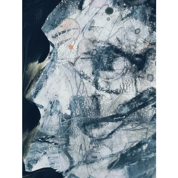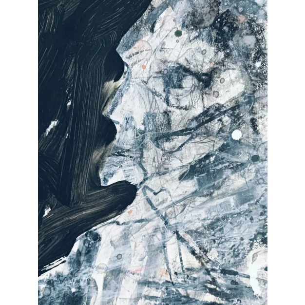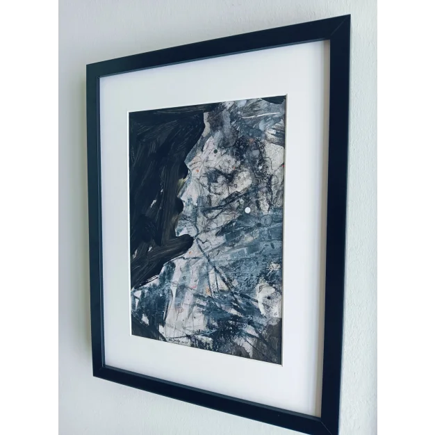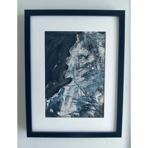 This framed painting is made with acrylic paint, pencil, marker, and charcoal on cardboard. The dimensions are 42 x 32 cm and it is 3.5 cm thick (this includes the mat and black frame). The work itself is 29 x 20 cm. Dated and hand-signed in 2025. Directly from the studio in Weert (NL).