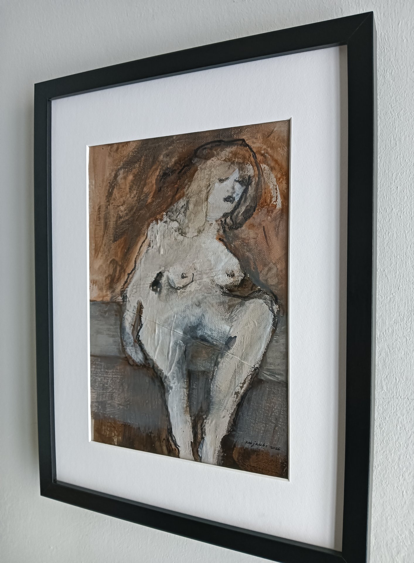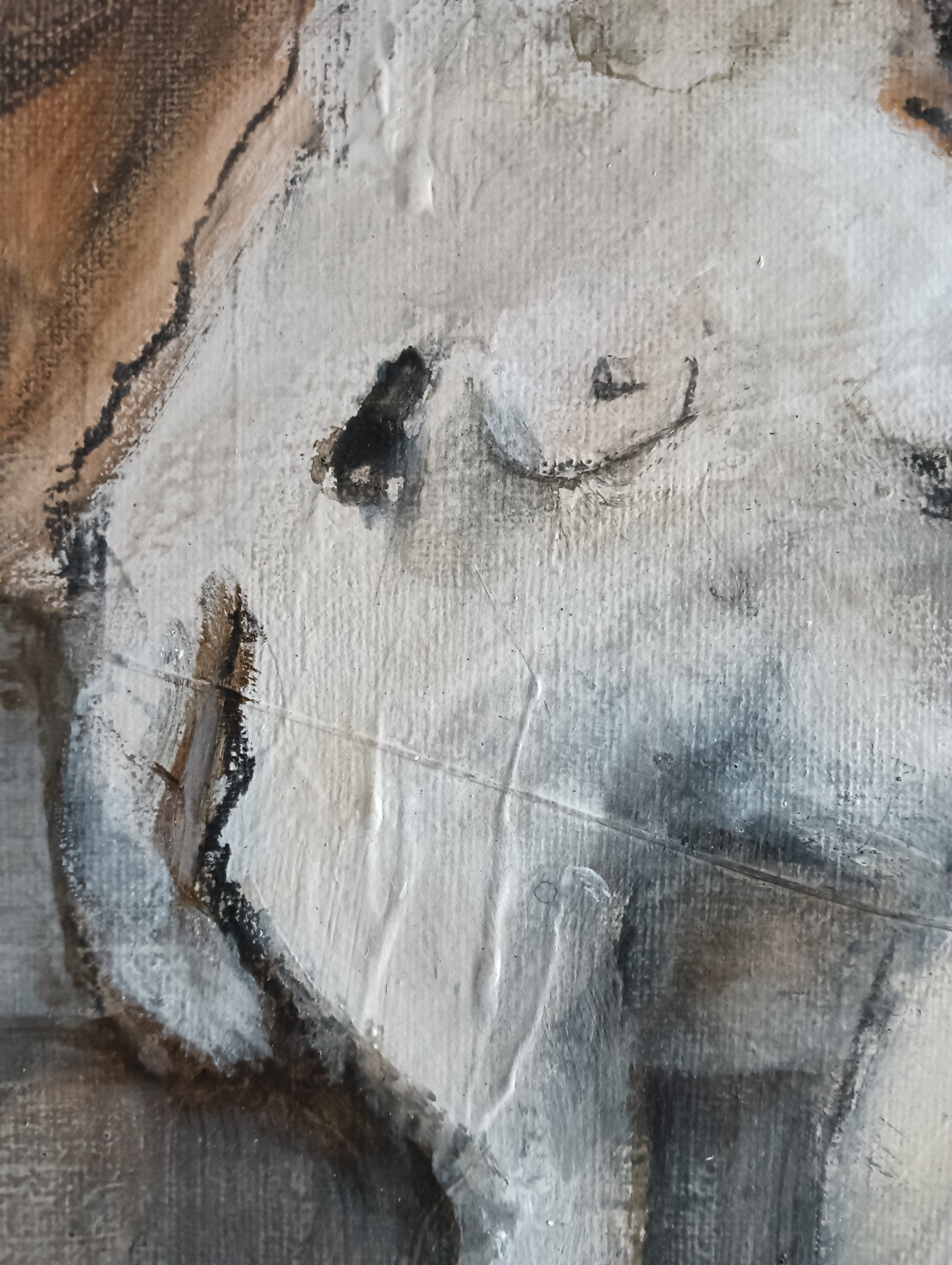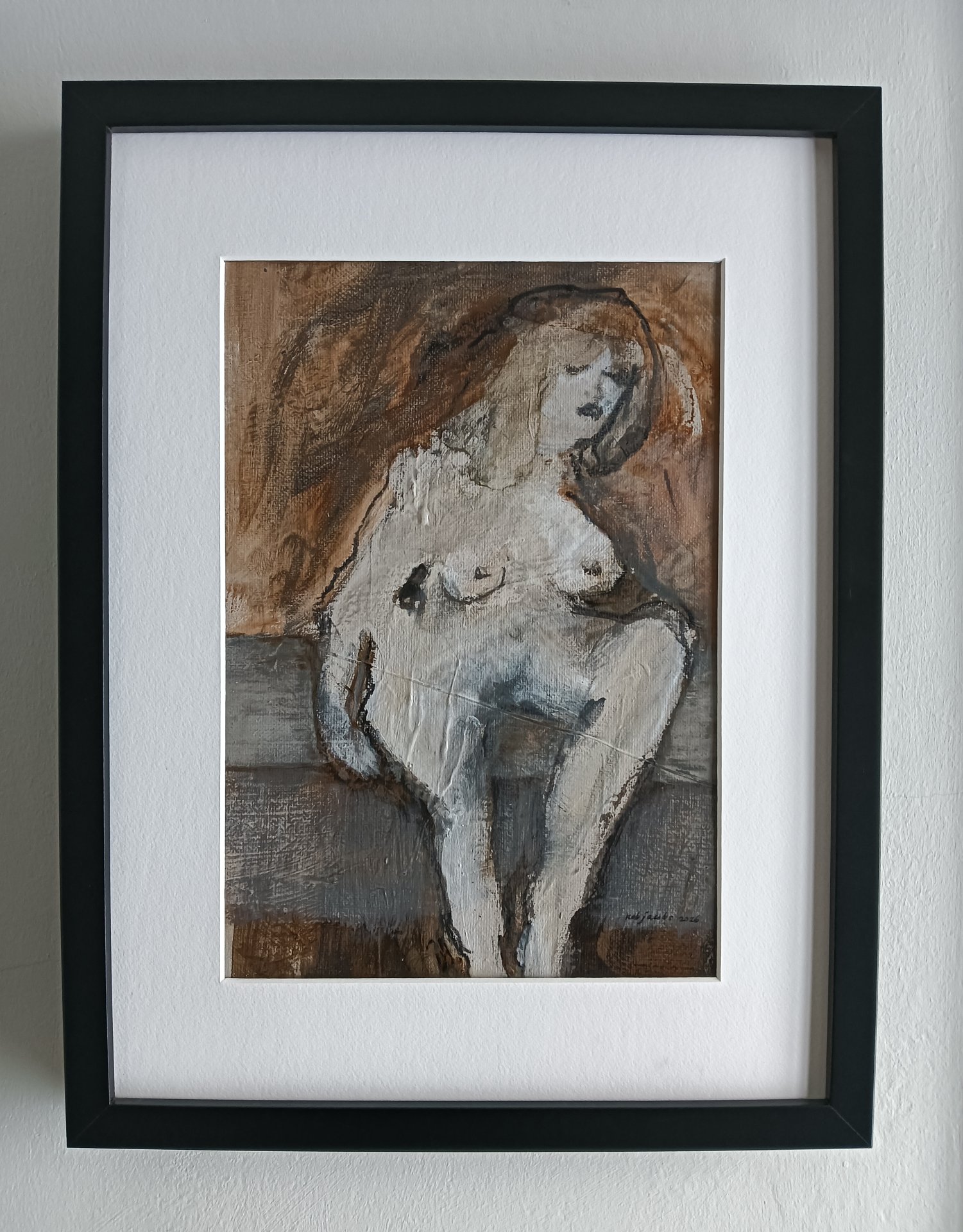 This framed work is made with acrylic paint and charcoal on a canvas. The dimensions are 42 x 32 cm and it is 3.5 cm thick (this includes passe partout and black frame). The work itself is 30 x 20 cm. Dated and hand-signed in 2026. Directly from the studio in Weert (NL).