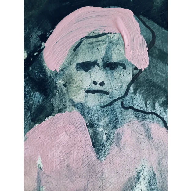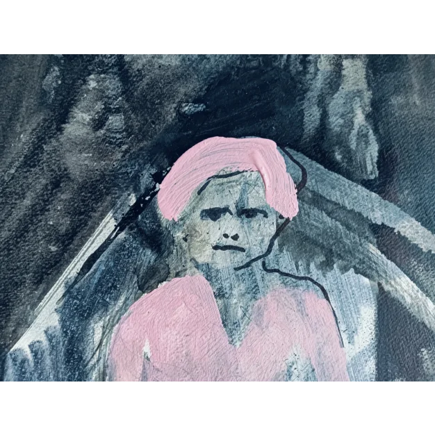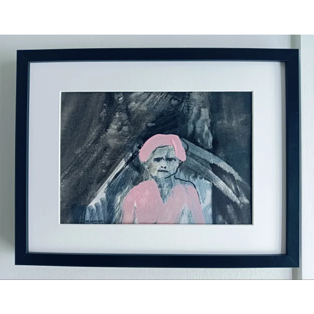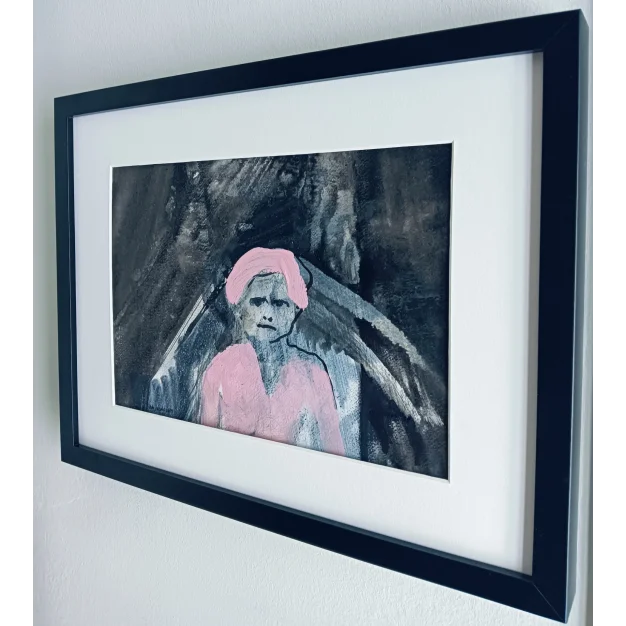 This framed painting is made with acrylic paint, marker, and charcoal on watercolor paper. The dimensions are 32 x 42 cm and it is 3.5 cm thick (this includes the mat and black frame). The work itself is 29 x 20 cm. Dated and hand-signed in 2025. Directly from the studio in Weert (NL).