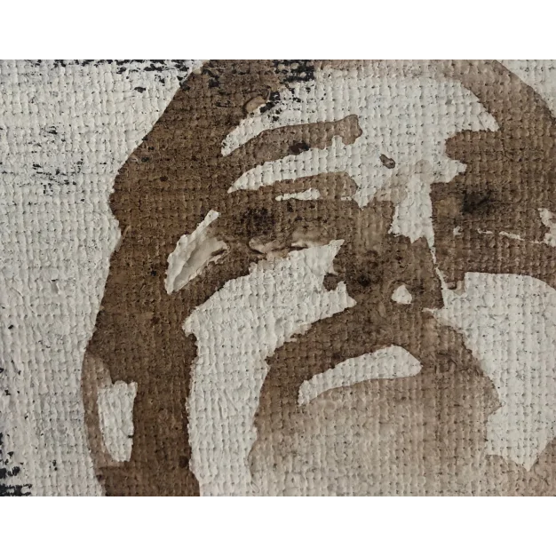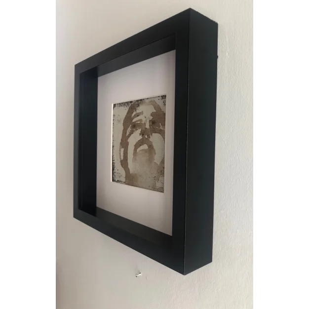 This framed work is painted with coffee with an underlayer of acrylic paint on a coarse linen canvas. The dimensions are 25 x 25 cm and 4.5 cm thick (this includes the passe-partout and black frame). The work itself is 12 x 12 cm. Dated and signed in 2018. Directly from the studio. If you want to see the work live, you are always welcome in Weert (NL).