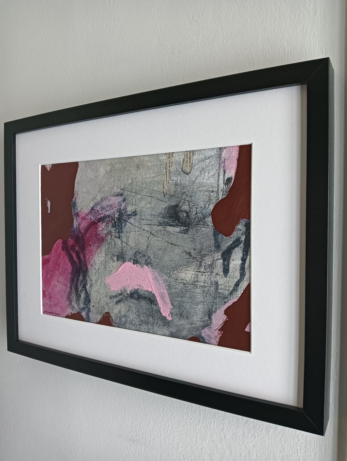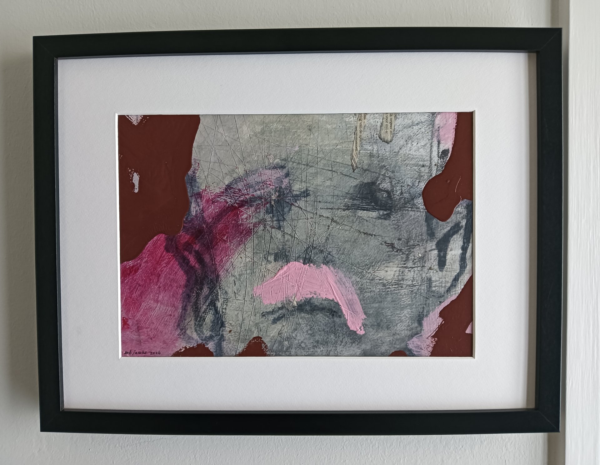 This framed work is made with acrylic paint, lacquer, and marker on watercolor paper. The dimensions are 42 x 32 cm and it is 3.5 cm thick (this includes passe partout and black frame). The work itself is 30 x 20 cm. Dated and hand-signed in 2026. Directly from the studio in Weert (NL).