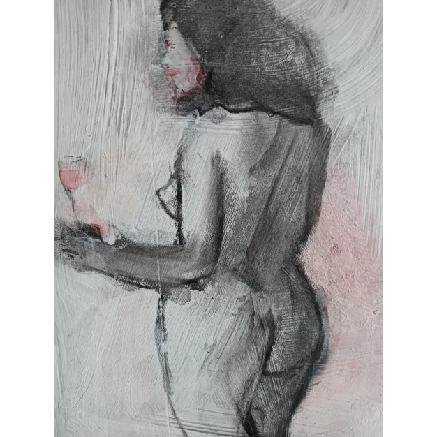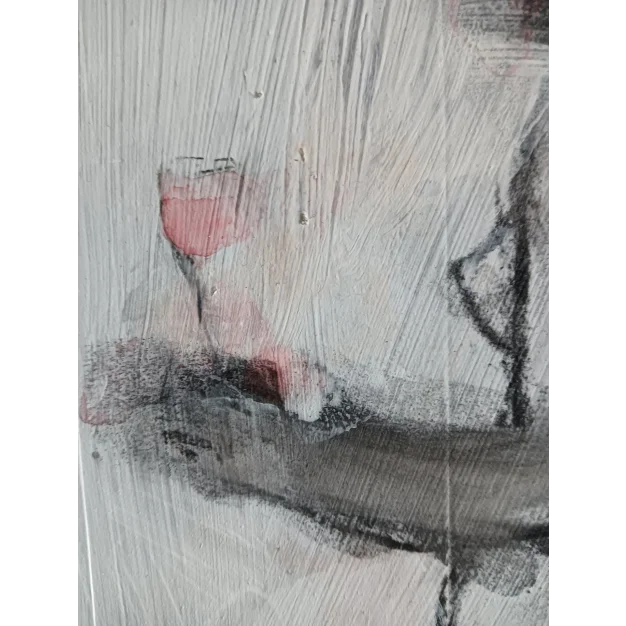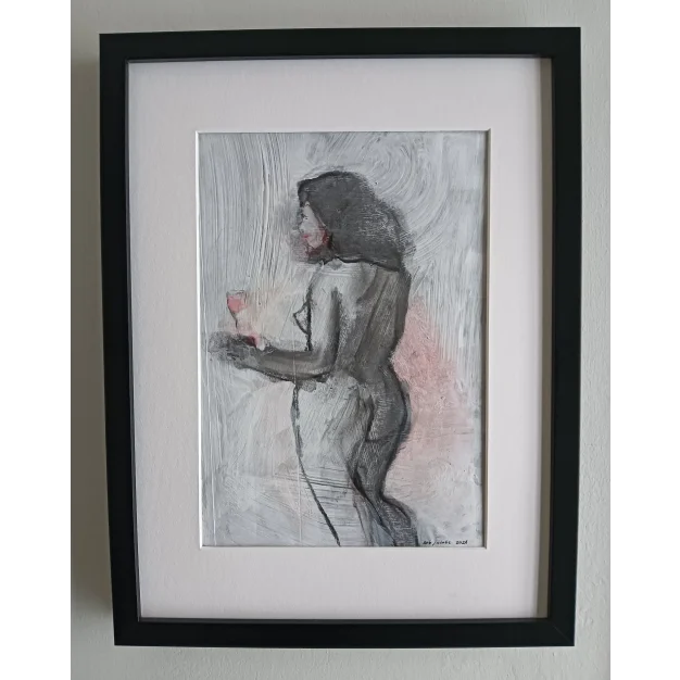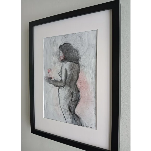 Dit ingelijst werk is gemaakt met acryl verf en houtskool op papier. De afmeting is 42 x 32 cm en is 3,5 cm dik (dit is inclusief passe partout en zwarte lijst). Het werk zelf is 29 x 20 cm. Gedateerd en hand gesigneerd in 2026. Rechtstreeks uit het atelier in Weert (NL).