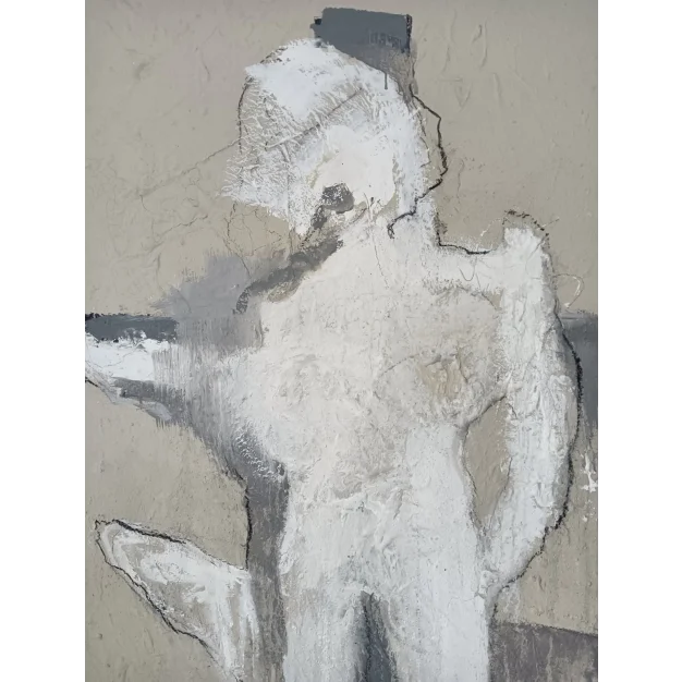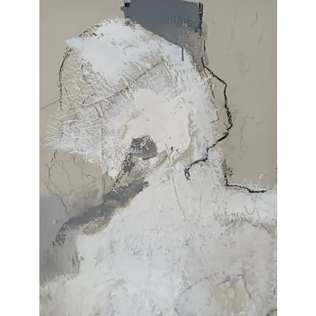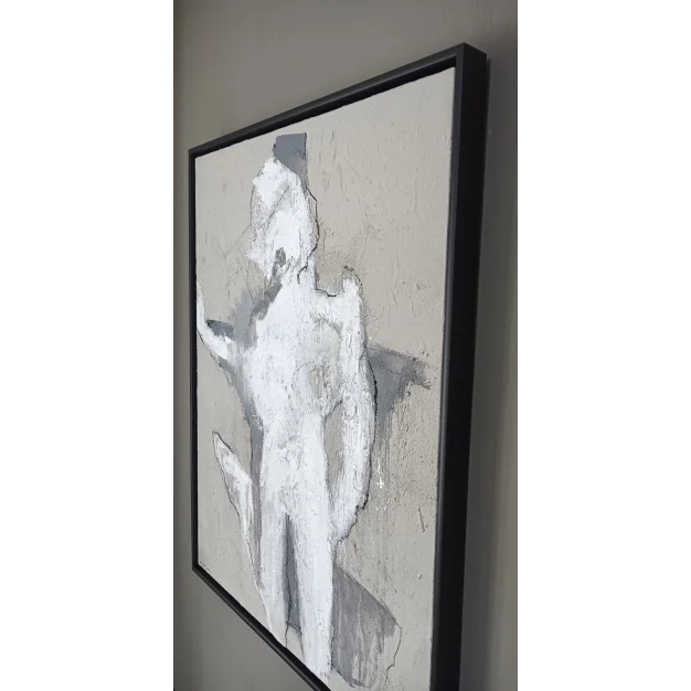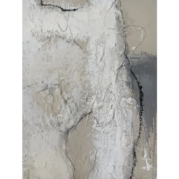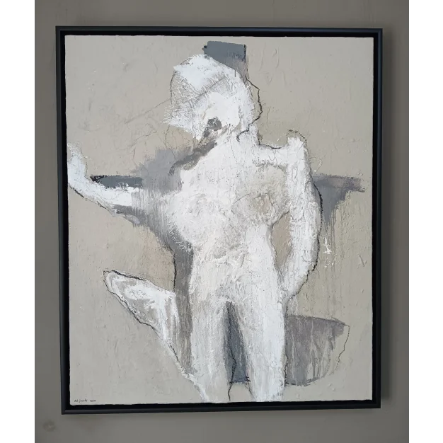 This framed painting is made with acrylic paint and charcoal on a linen canvas. The use of thicker layers of paint and sand gives the painting a beautiful relief. The dimensions are 125 x 105 cm and it is 5.5 cm thick (this includes the black frame). The painting itself is 120 x 100 cm and is 2.5 cm thick. Dated and hand-signed in 2025. Directly from the studio in Weert (NL).