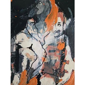 This expressive work is made with acrylic paint, lacquer paint, and marker on cardboard. The dimensions are 42 x 32 cm and are 3.5 cm thick (this includes passe-partout and black frame). The work itself is 30 x 20 cm. Directly from the studio in Weert (NL).