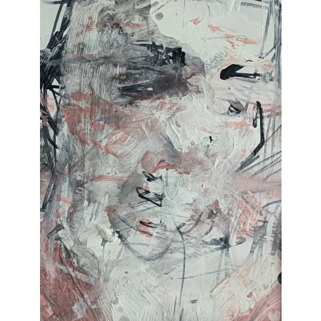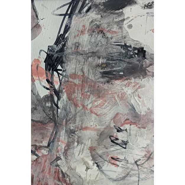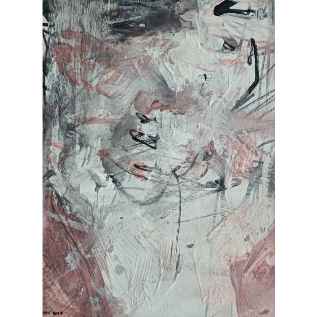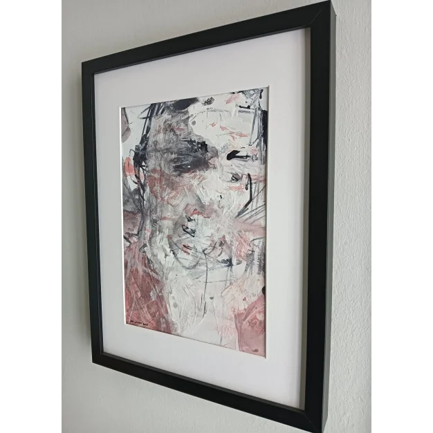 This framed expressive work is made with acrylic paint and marker on cardboard. The dimensions are 42 x 32 cm and it is 3.5 cm thick (this includes the mat and black frame). The work itself is 29 x 20 cm. Dated and hand-signed in 2025. Directly from the artist's studio.