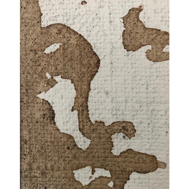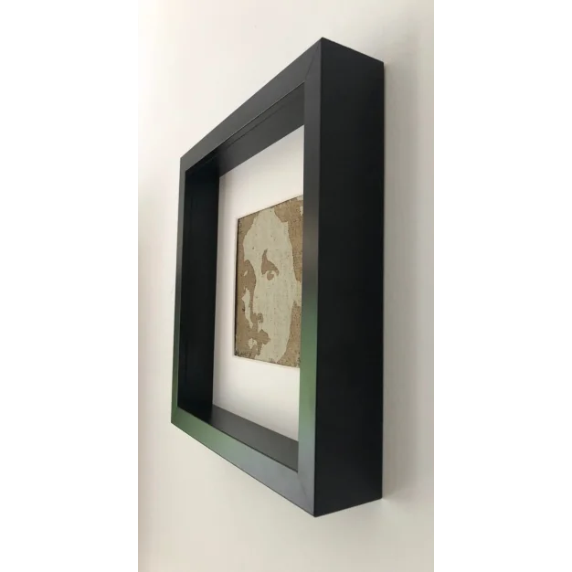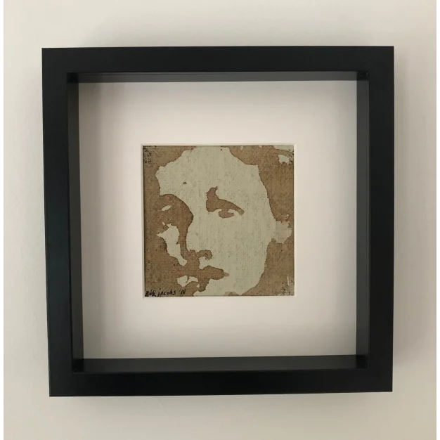 This framed work is made with acrylic paint (background) and coffee on a coarse linen canvas. The dimensions are 25 x 25 cm and it is 4 cm thick (this includes the mat and black frame). The piece itself is 12 x 12 cm. Dated and hand-signed in 2018. Directly from the artist's studio.