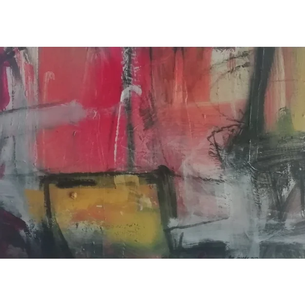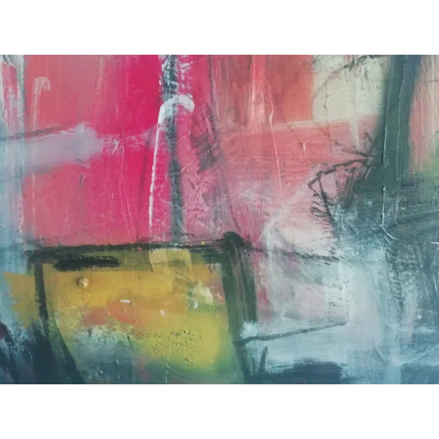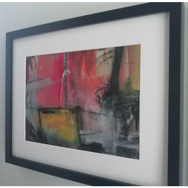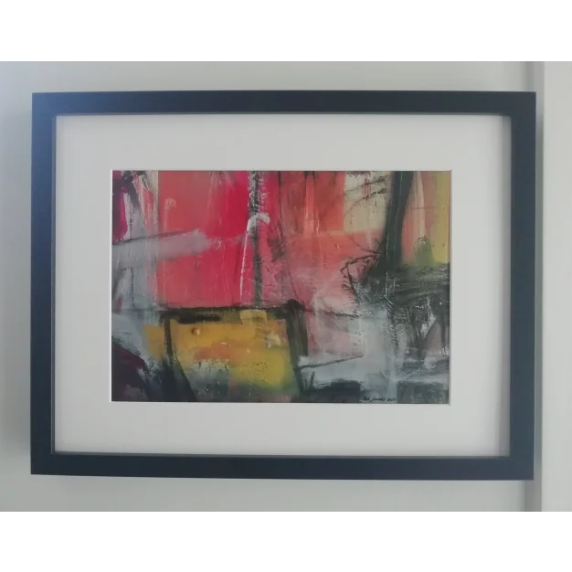 This work is painted with acrylic paint, oil pastel, and charcoal on a linen canvas. The dimensions are 32 x 42 cm and 3.5 cm thick (including the passe-partout and black frame). The work itself is 20 x 29 cm. Dated and signed in 2023. Directly from the studio. If you want to see the work live, you are always welcome in Weert (NL).
