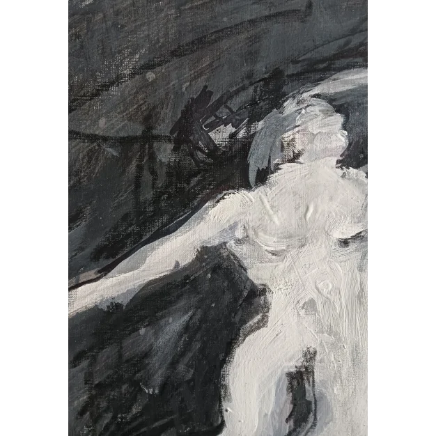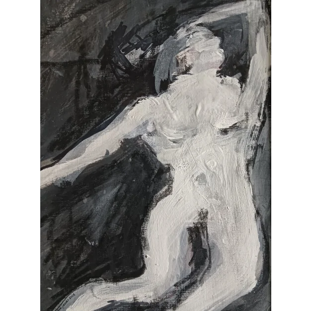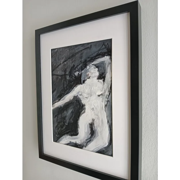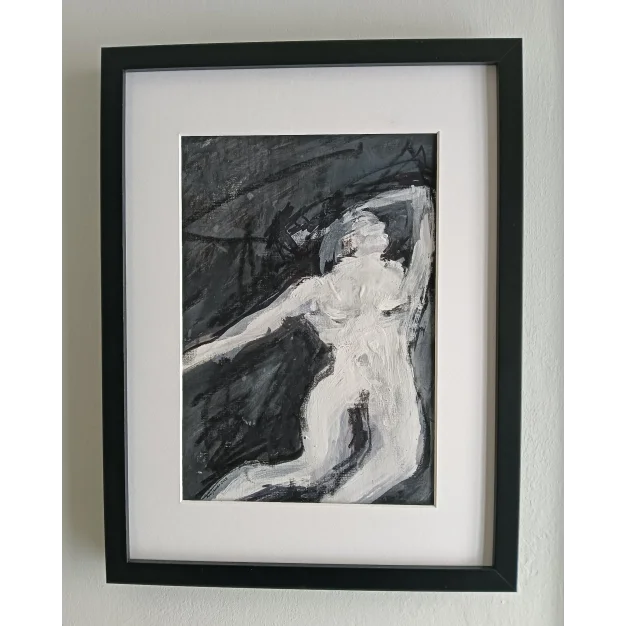 This framed work is made with acrylic paint, marker, and charcoal on linen paper. The dimensions are 42 x 32 cm and it is 3.5 cm thick (this includes the mat and black frame). The work itself is 29 x 20 cm. Dated and hand-signed in 2025. Directly from the artist's studio.