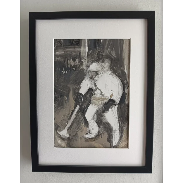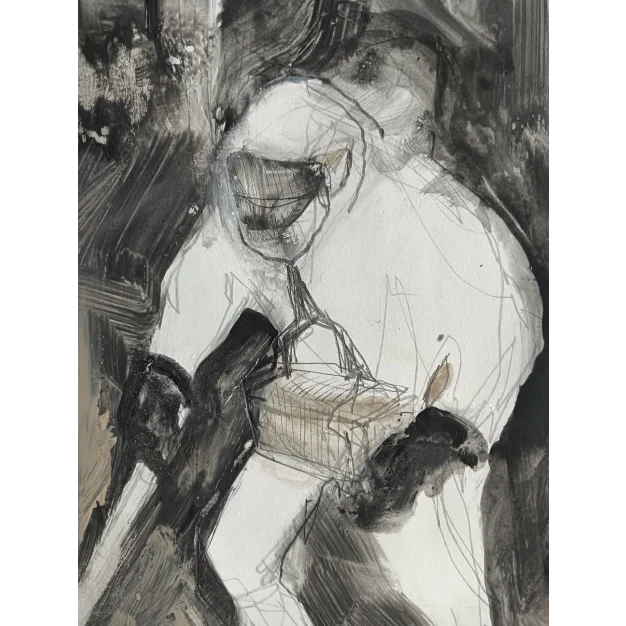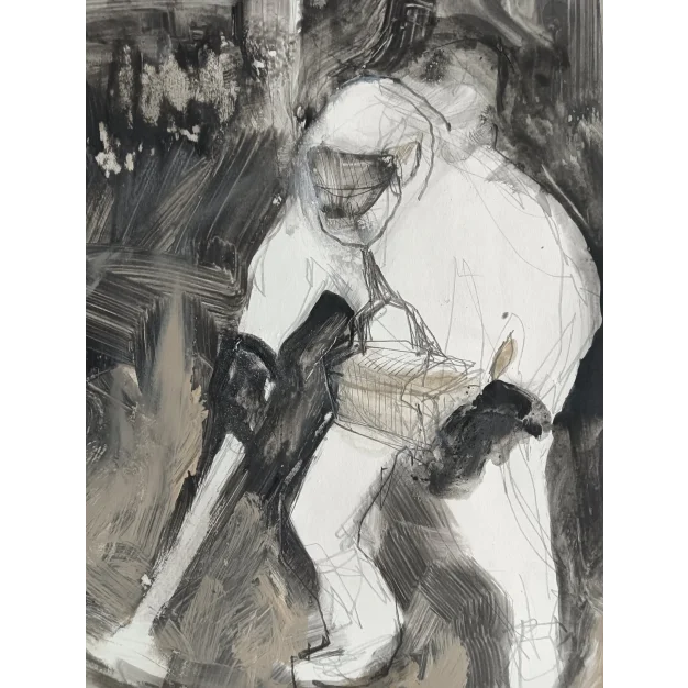 Dit ingelijst schilderij is gemaakt met acryl verf en potlood op karton. De afmeting is 42 x 32 cm en is 3,5 cm dik (dit is inclusief passe partout en zwarte lijst). Het werk zelf is 29 x 20 cm. Gedateerd en hand gesigneerd in 2025. Rechtstreeks uit het atelier in Weert (NL). Het werk gaat over de ramp in Tsjernobyl 1986, waar de overheid het niet zo nauw nam met de welzijn van de arbeiders die de boel aldaar moesten “ opruimen ” ! Ze kregen een premie. Dertig roebel de man. Een fles wodka kostte drie roebel. Ze hebben zichzelf “ ontsmet ” !!