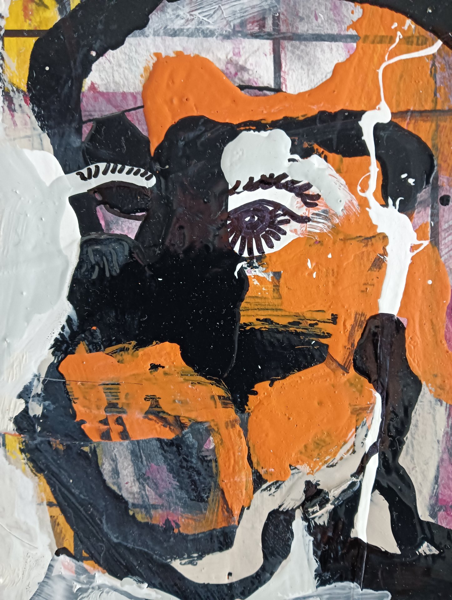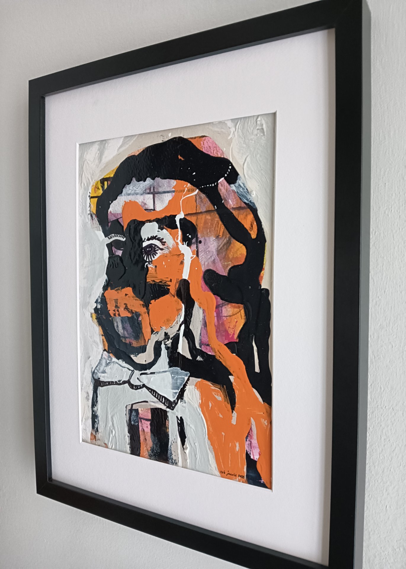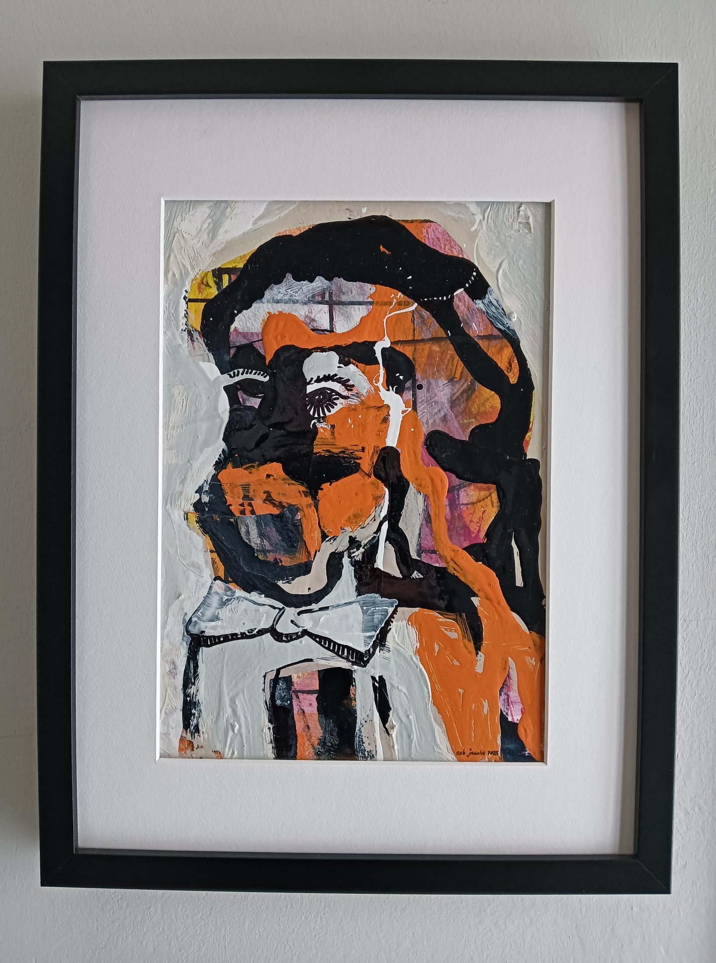 Dit expressief werk is gemaakt met acryl verf, lakverf, stift en houtskool op aquarel papier. De afmeting is 42 x 32 cm en is 3,5 cm dik (dit is inclusief passe partout en zwarte lijst). Het werk zelf is 29 x 20 cm. Gedateerd en hand gesigneerd in 2025. Rechtstreeks uit het atelier in Weert (NL).