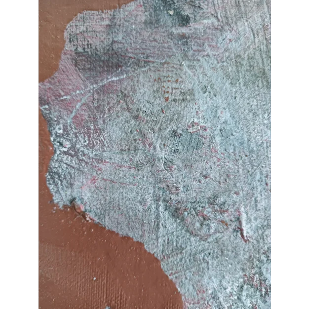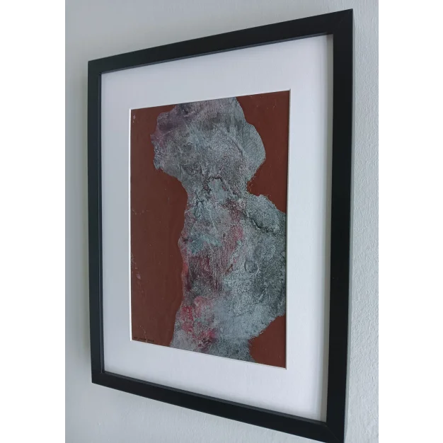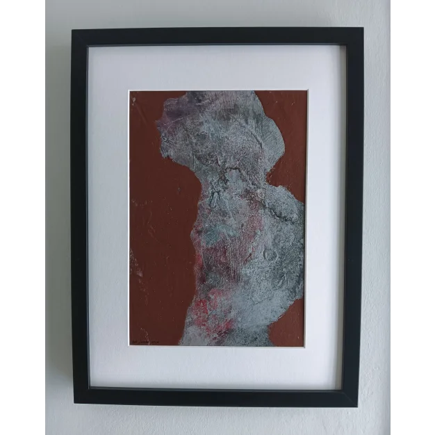 This framed painting is made with acrylic paint, lacquer, and charcoal on a linen canvas. Additionally, sand and leftover pieces of paint are incorporated. The dimensions are 42 x 32 cm and it is 3.5 cm thick (this includes the mat and black frame). The work itself is 29 x 20 cm. Dated and hand-signed in 2025. Directly from the studio in Weert (NL).