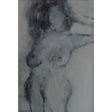 Esta obra expresiva fue creada en 2017. Los materiales utilizados son pintura acrílica, tiza y marcador sobre cartón.