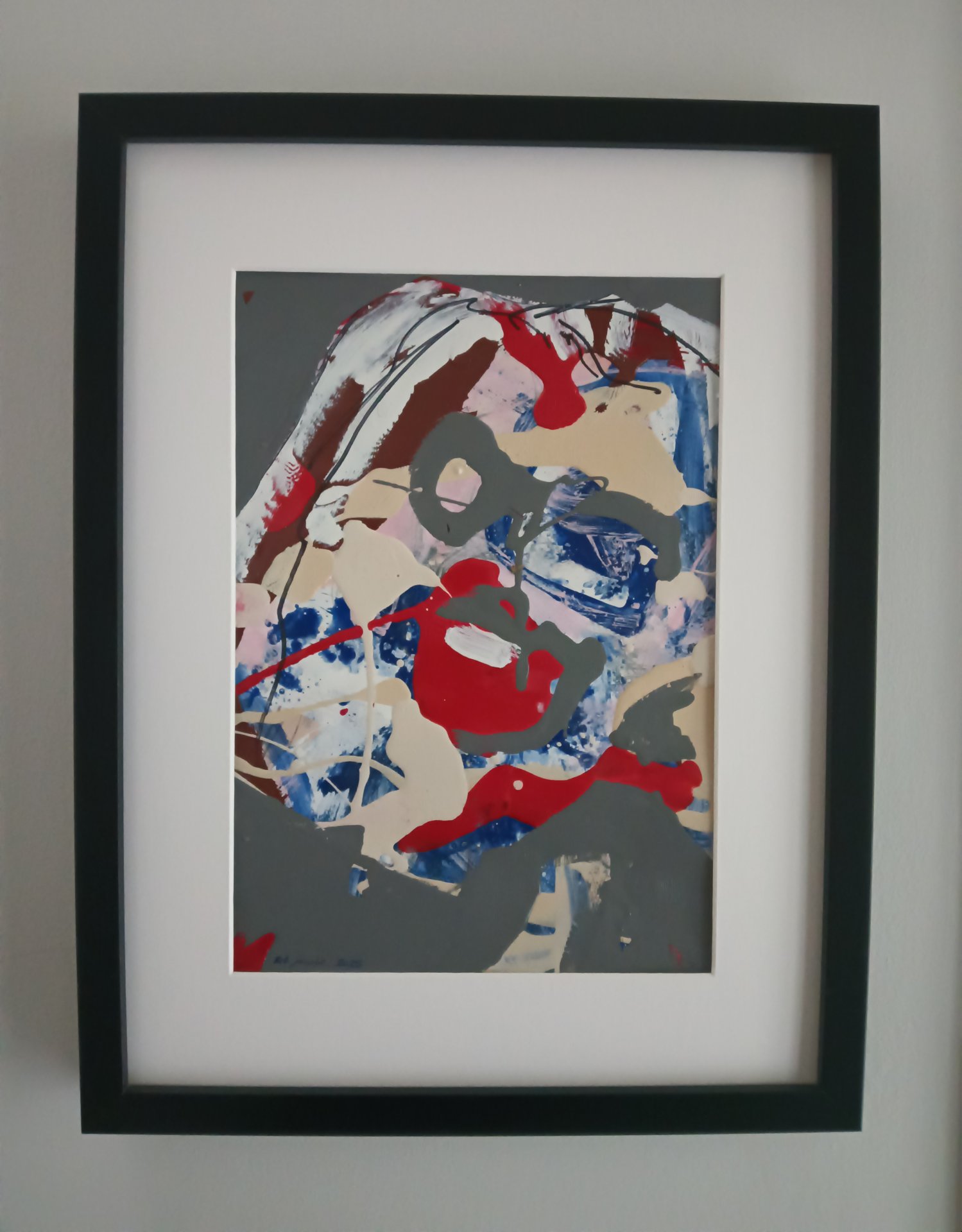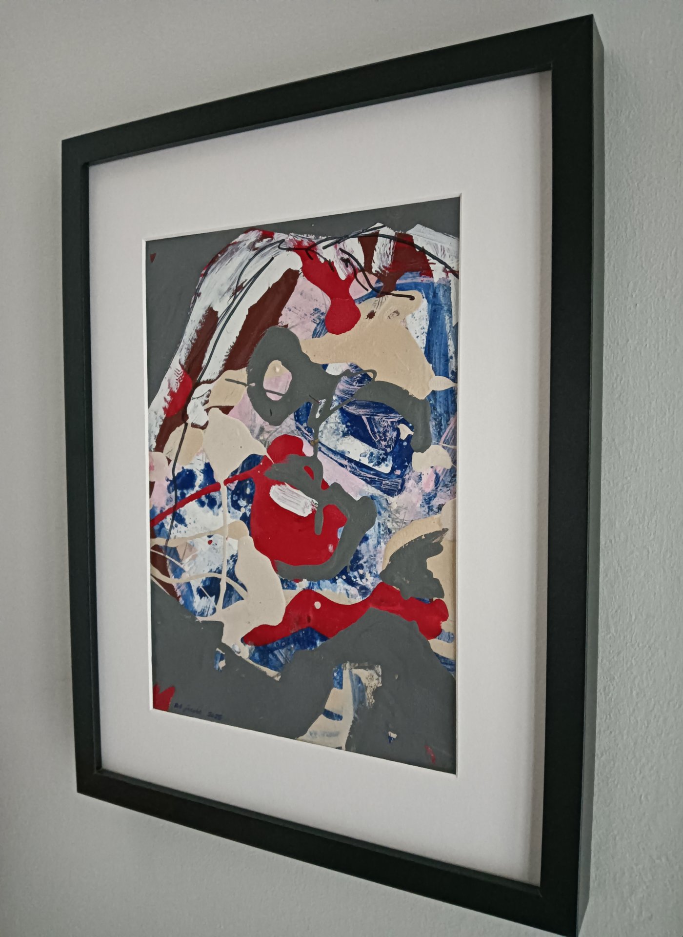Esta obra expresiva enmarcada está hecha con pintura acrílica, pintura de laca y marcador sobre cartón. Las dimensiones son 42 x 32 cm y tiene 3,5 cm de grosor (incluido el passe-partout y el marco negro). La obra en sí mide 29 x 20 cm. Fechada y firmada a mano en 2025. Directamente del estudio en Weert (NL). Si deseas ver más obras mías, visita mi sitio web: www.robjacobs.art