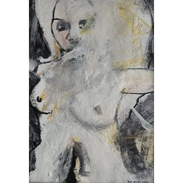 Esta pintura fue hecha en mi estudio en Weert (NL), y una hermosa dama posó para ella. Los materiales utilizados son pintura acrílica y carbón sobre un lienzo. Las dimensiones son 32 x 42 cm y 3,5 cm de grosor (esto incluye passe-partout y marco negro). La obra en sí mide 29 x 20 cm. Fechado y firmado en 2023. Directamente del estudio. Si quieres ver la obra en vivo, siempre eres bienvenido en Weert (NL).
