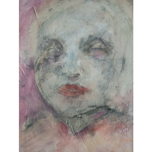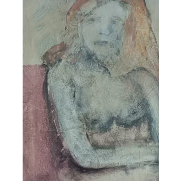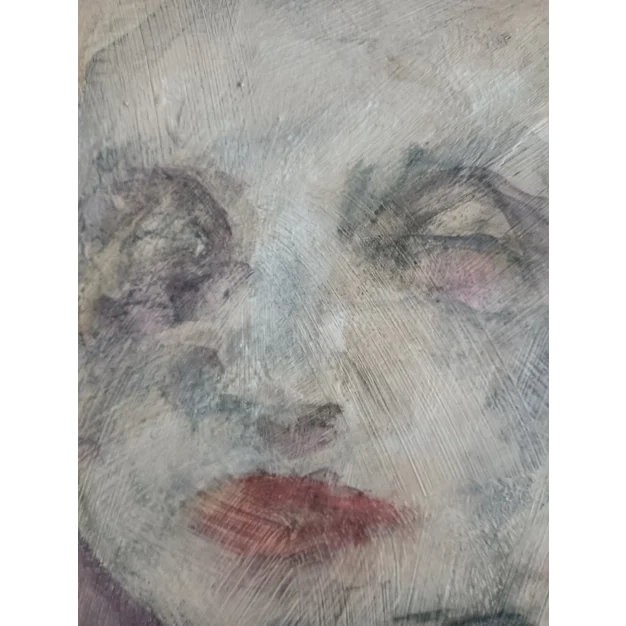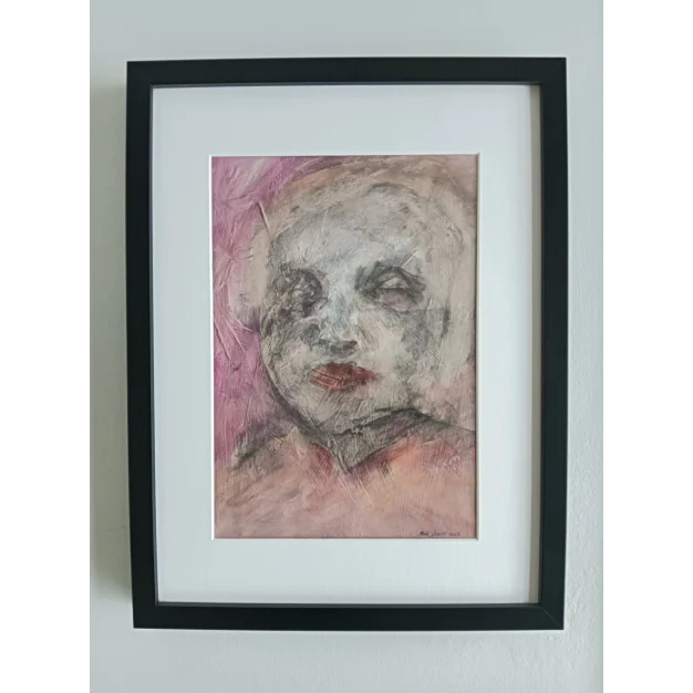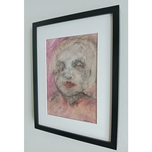 Dit ingelijst werk is gemaakt met acryl verf en houtskool op karton. De afmeting is 42 x 32 cm en is 3,5 cm dik (dit is inclusief passe partout en zwarte lijst). Het werk zelf is 29 x 20 cm. Rechtstreeks uit het atelier in Weert (NL).