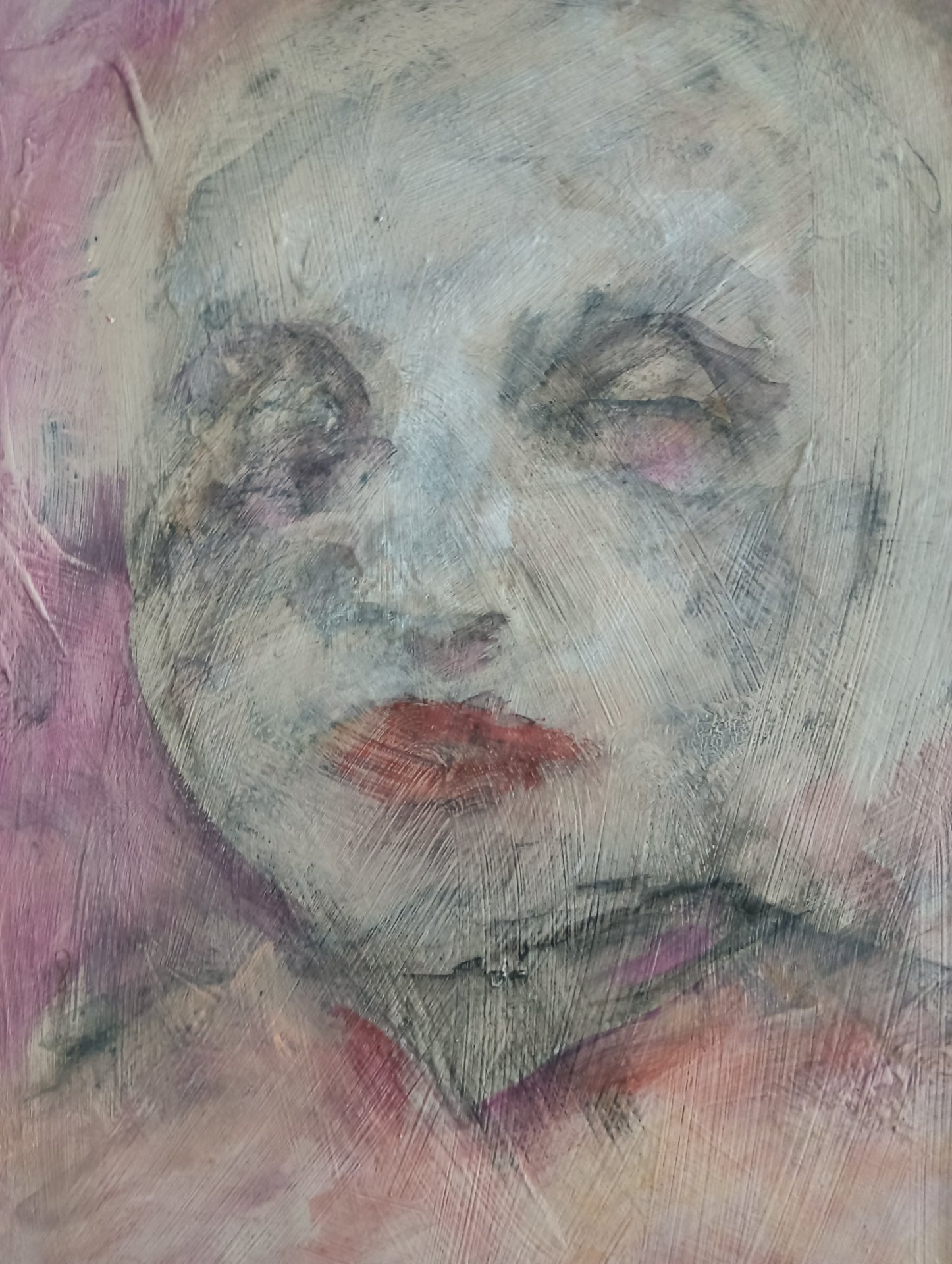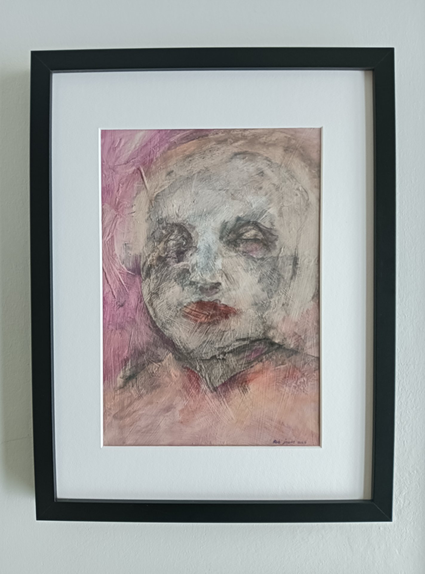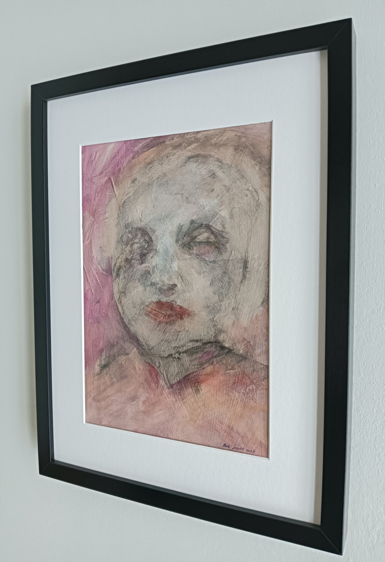Dit ingelijst werk is gemaakt met acryl verf en houtskool op karton. De afmeting is 42 x 32 cm en is 3,5 cm dik (dit is inclusief passe partout en zwarte lijst). Het werk zelf is 29 x 20 cm. Rechtstreeks uit het atelier in Weert (NL).