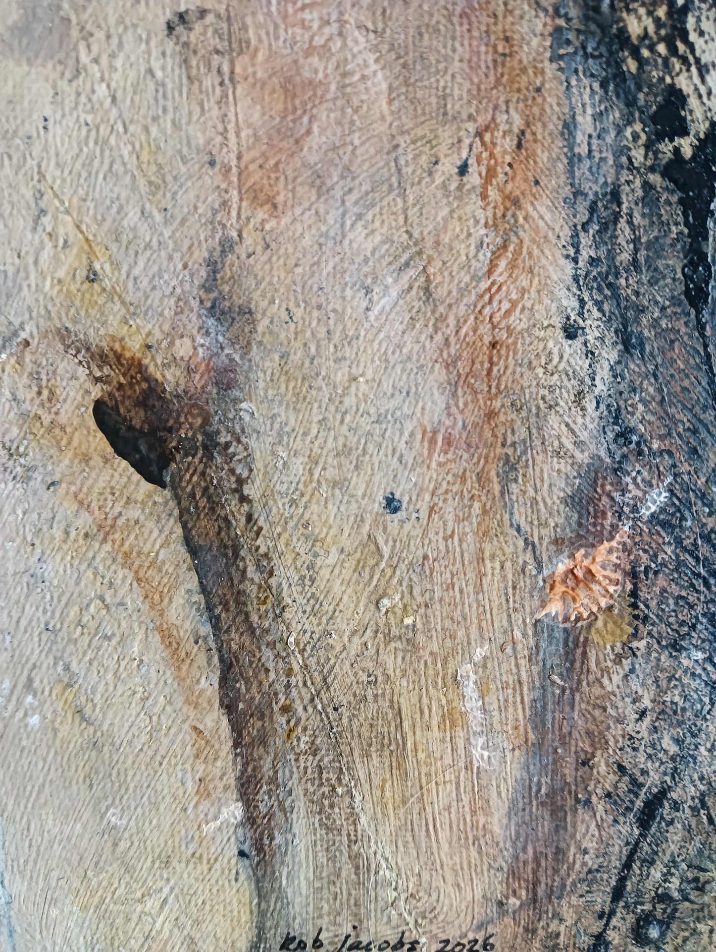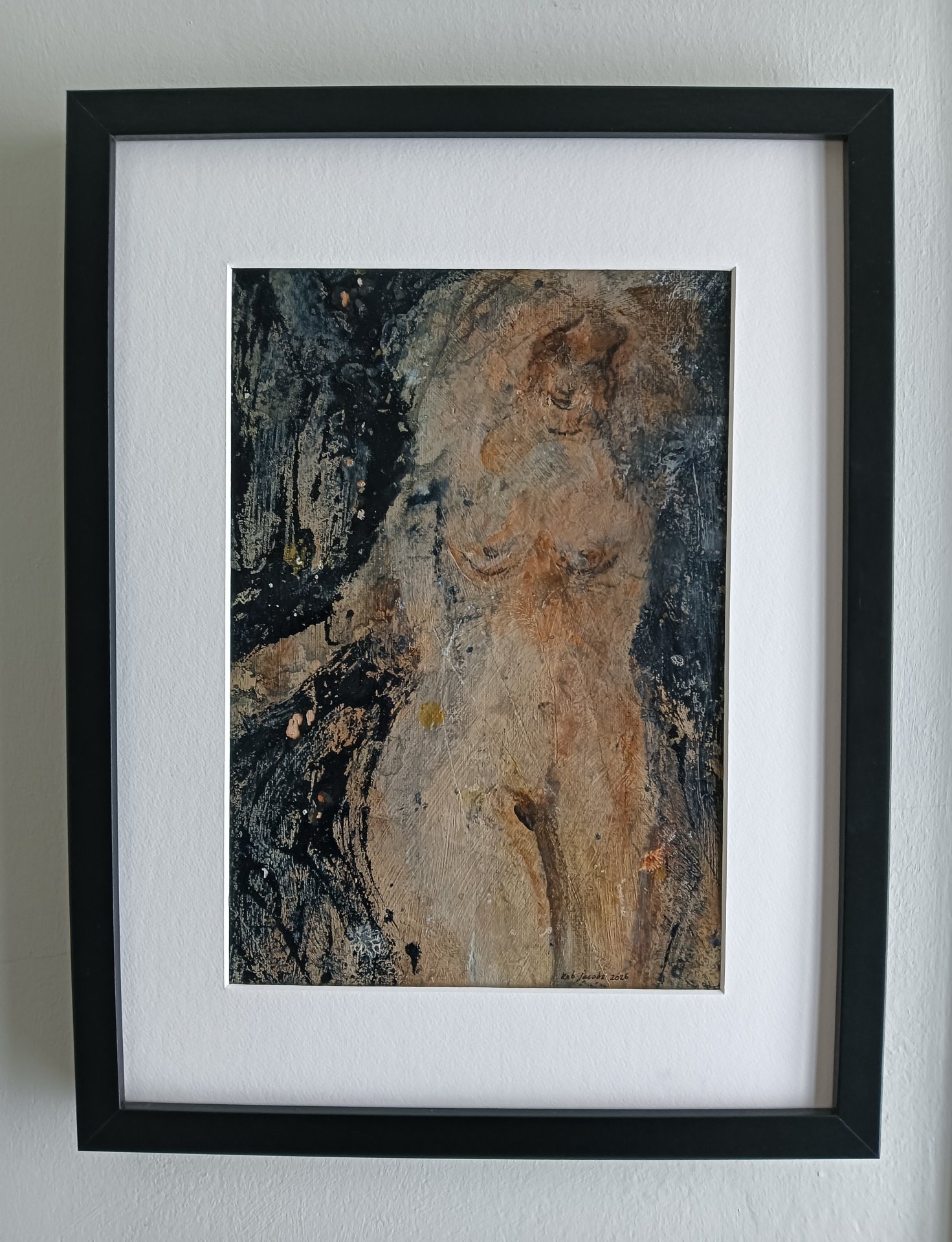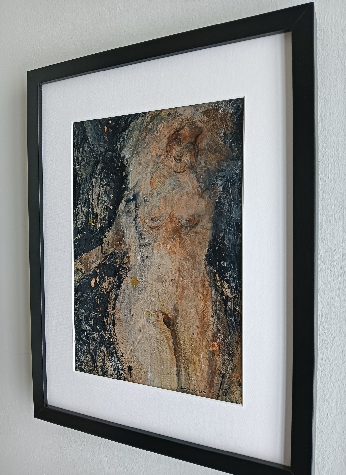 Cette œuvre encadrée est réalisée avec de la peinture acrylique, du vernis et du charbon sur une toile. Les dimensions sont de 42 x 32 cm et elle fait 3,5 cm d'épaisseur (cela inclut le passe-partout et le cadre noir). L'œuvre elle-même mesure 29 x 20 cm. Datée et signée à la main en 2026. Directement de l'atelier à Weert (NL).