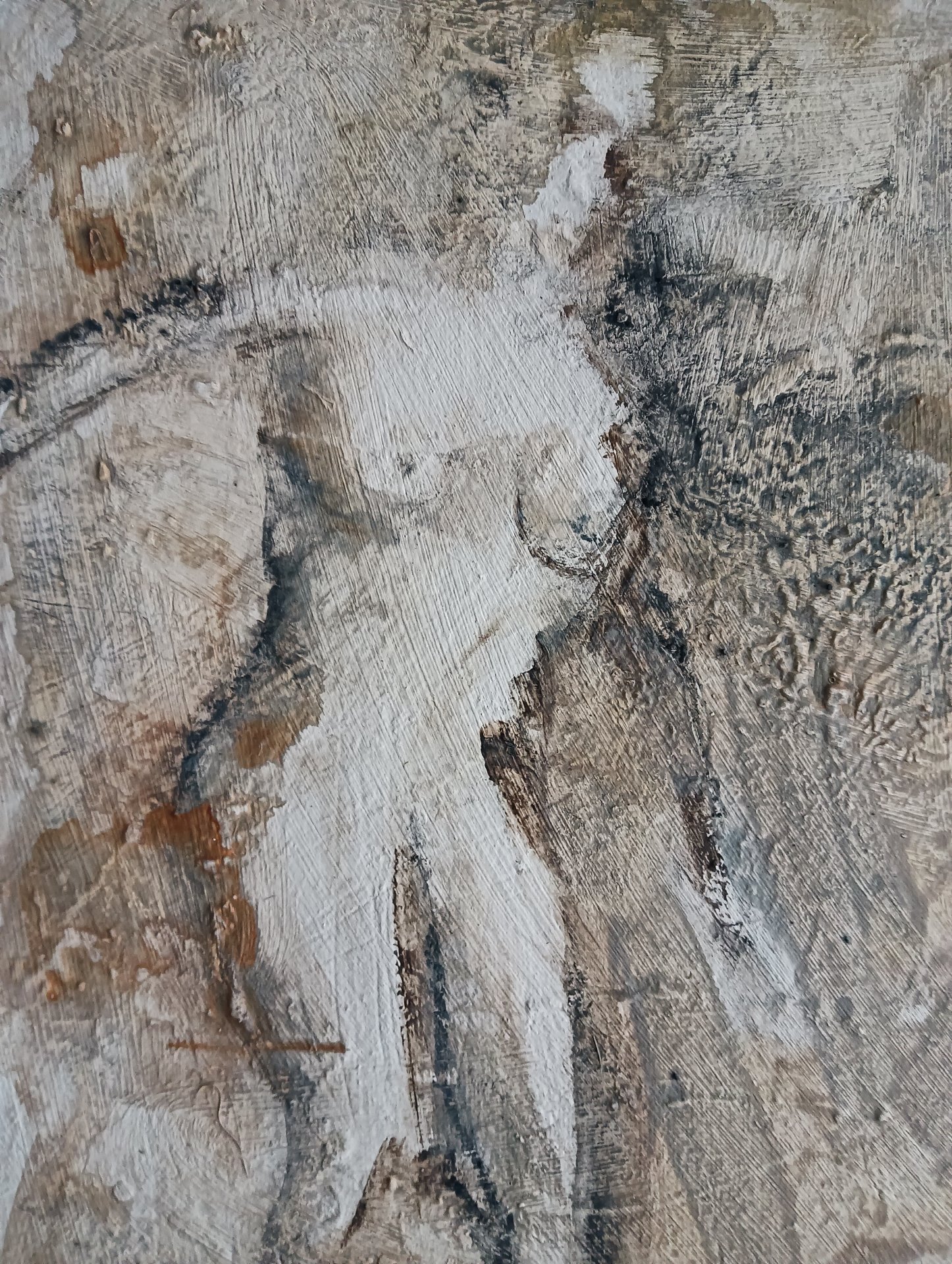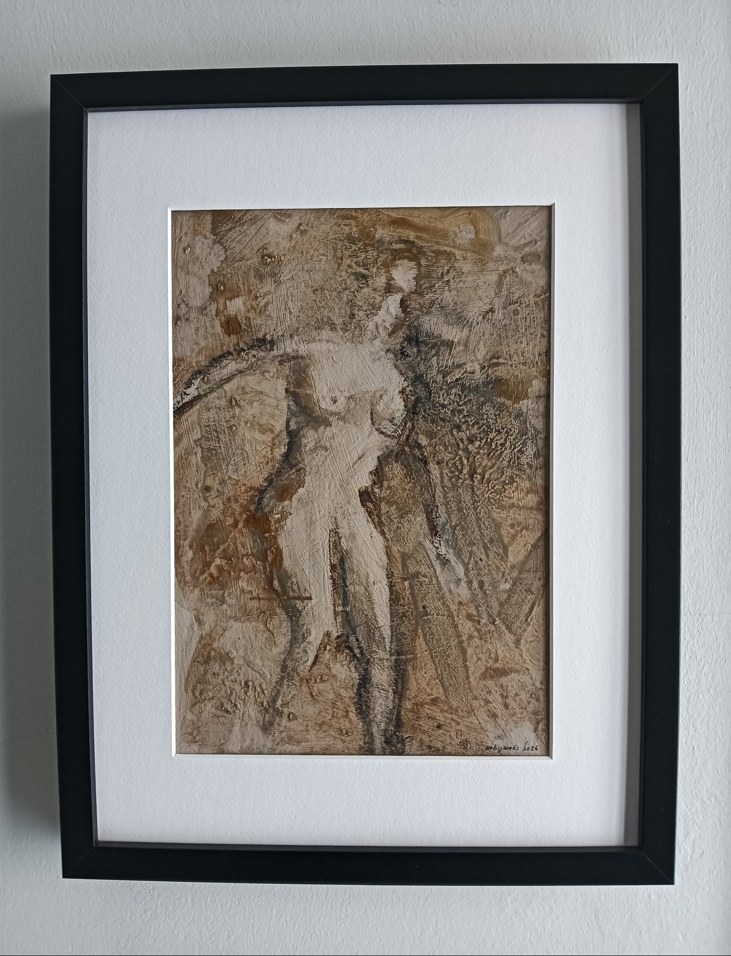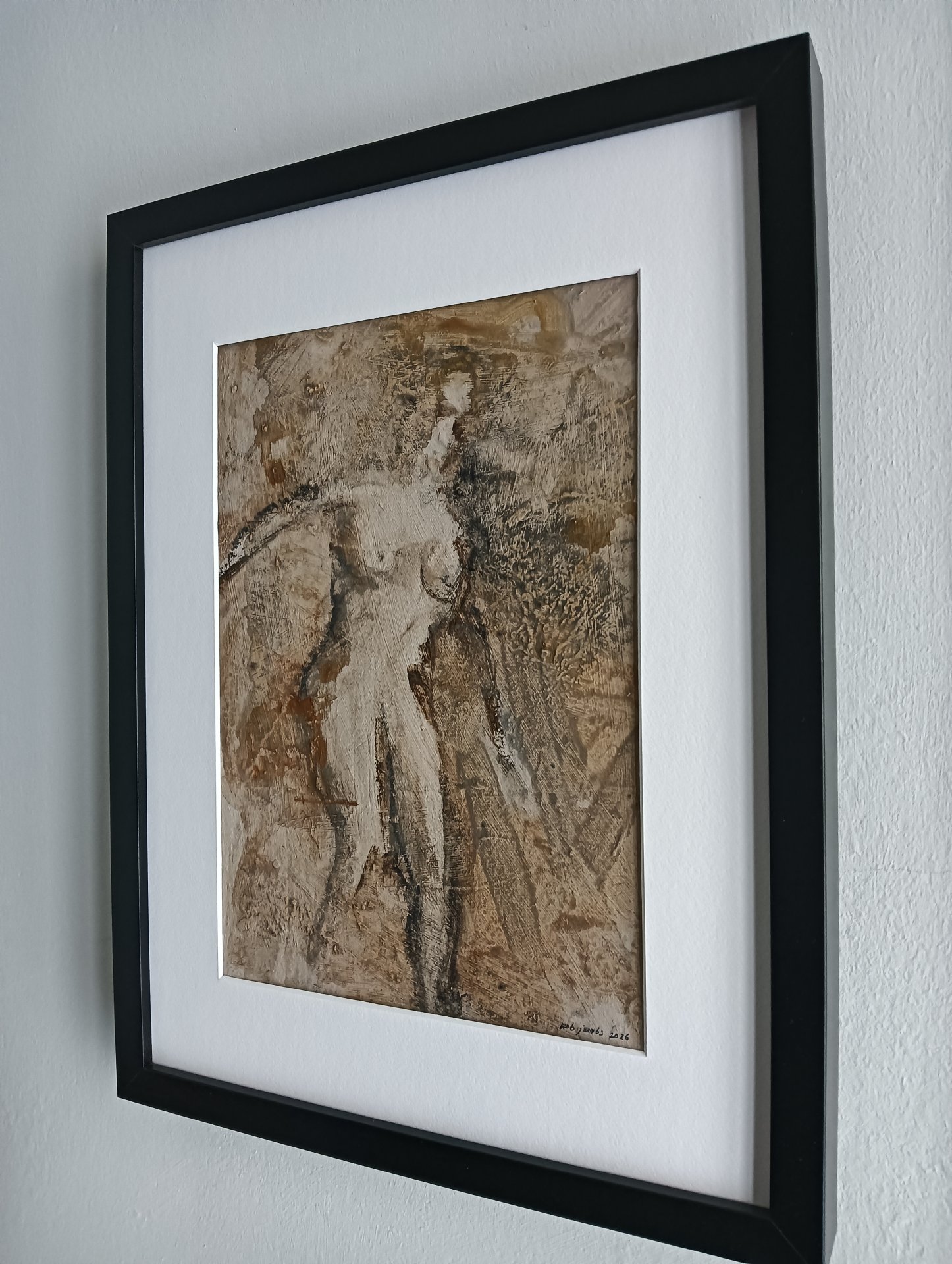 Dit ingelijst kunstwerk is gemaakt met acryl verf en houtskool op een hoogwaardig canvas doek. De afmeting is 42 x 32 cm en is 3,5 cm dik (dit is inclusief passe partout en zwarte lijst). Het werk zelf is 29 x 20 cm. Rechtstreeks uit het atelier in Weert (NL).