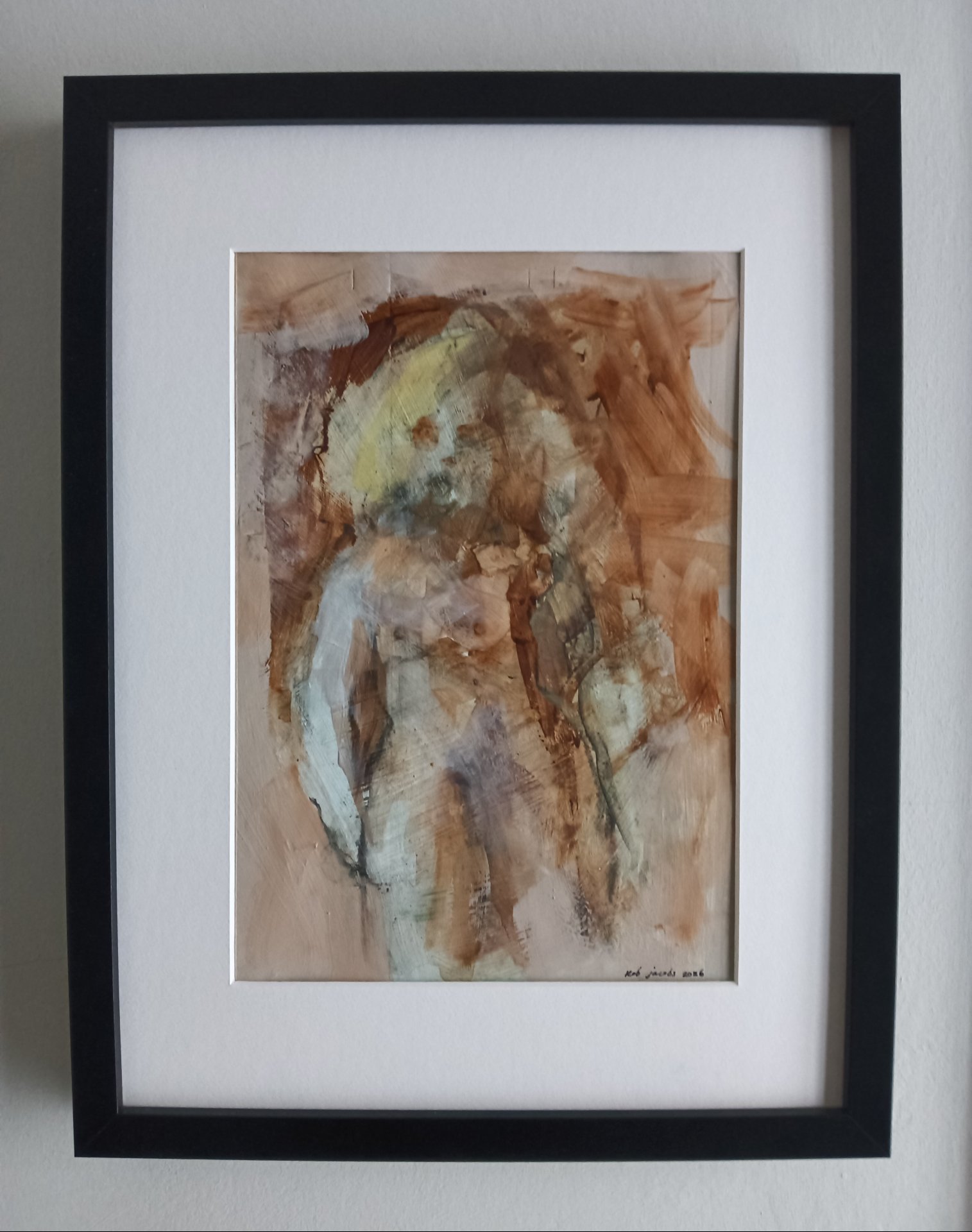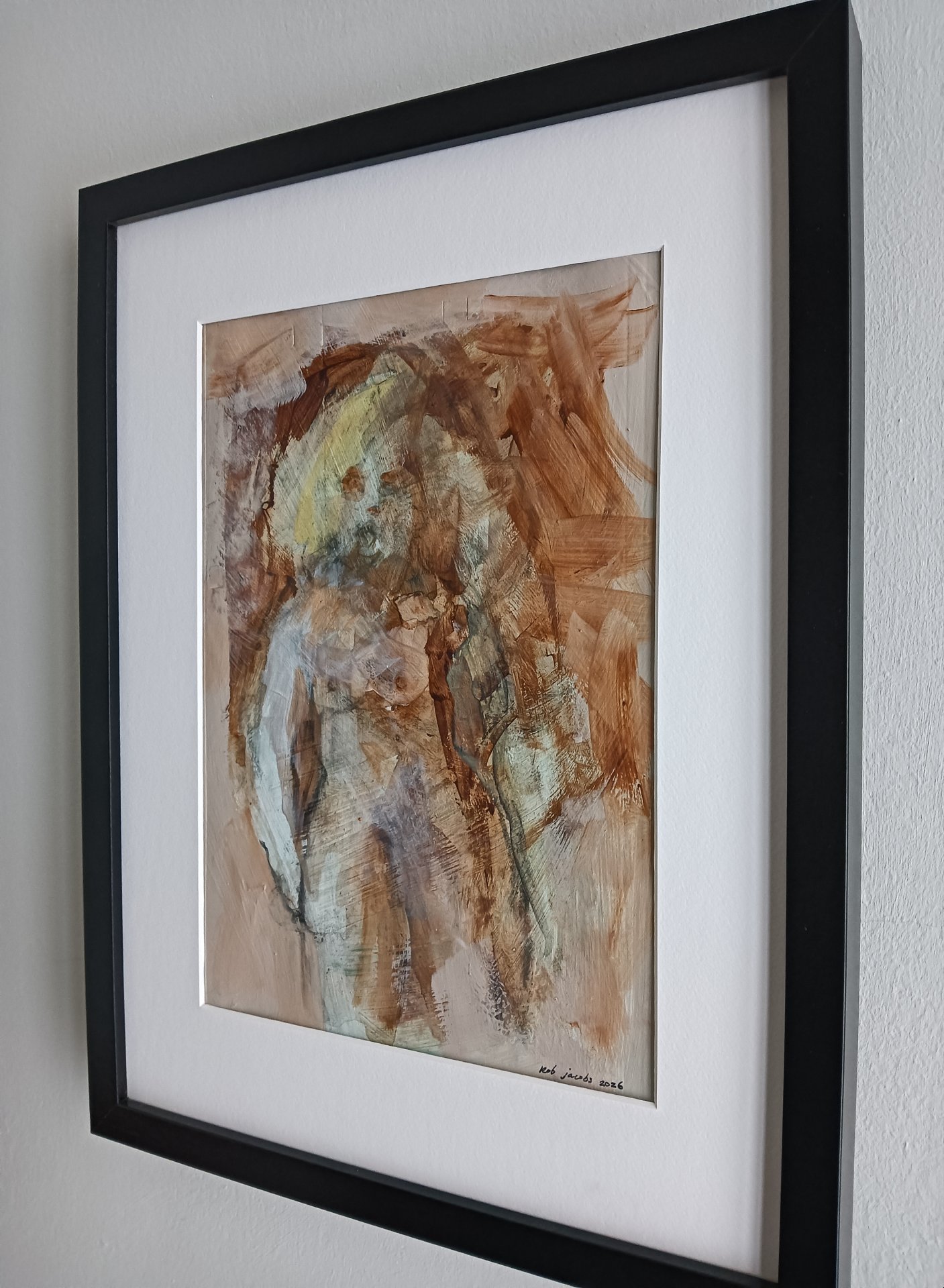 Cette œuvre encadrée est réalisée avec de la peinture acrylique et du charbon sur papier. Les dimensions sont de 42 x 32 cm et elle fait 3,5 cm d'épaisseur (cela inclut le passe-partout et le cadre noir). L'œuvre elle-même mesure 29 x 20 cm. Datée et signée à la main en 2026. Directement de l'atelier à Weert (NL).