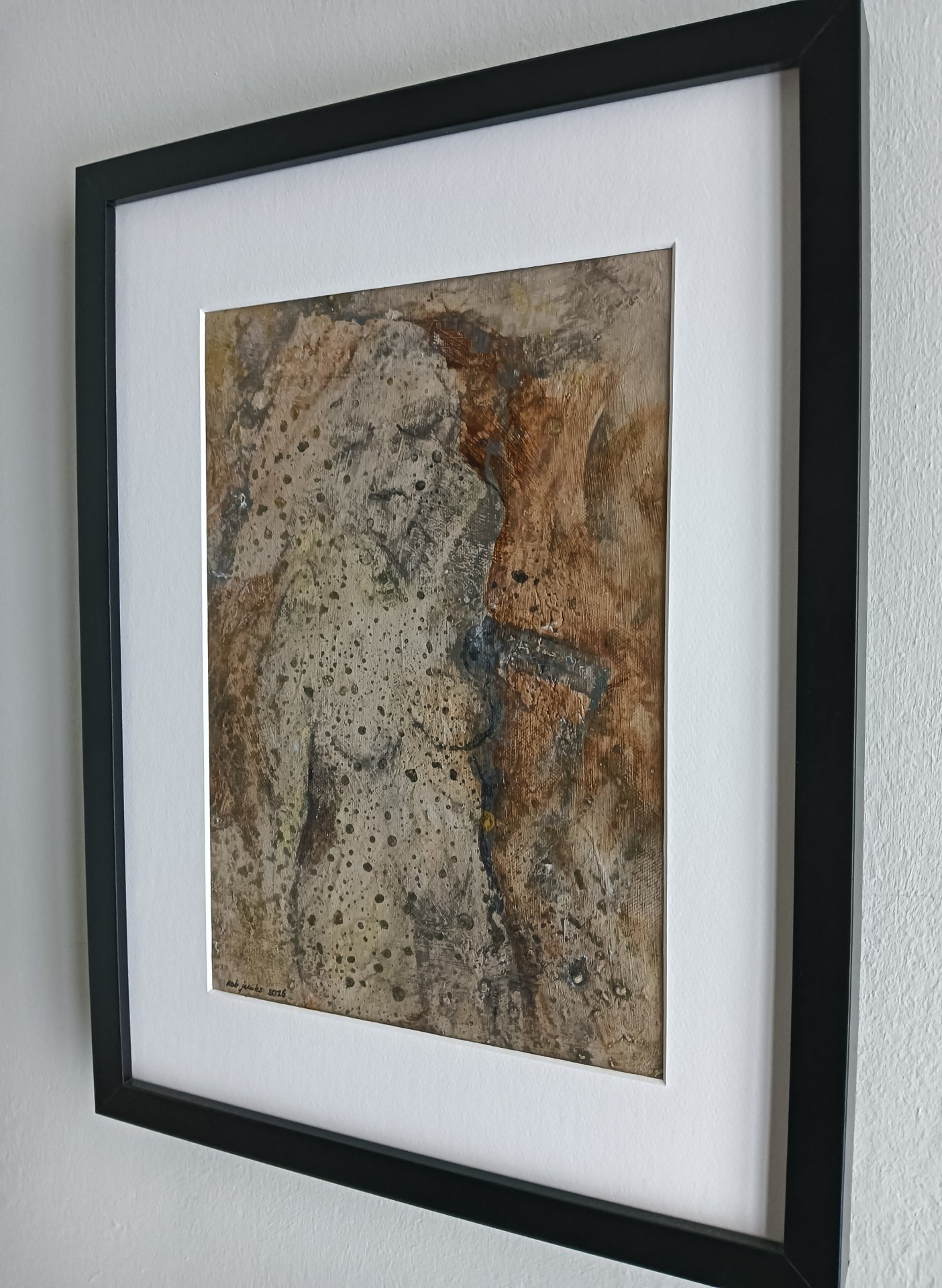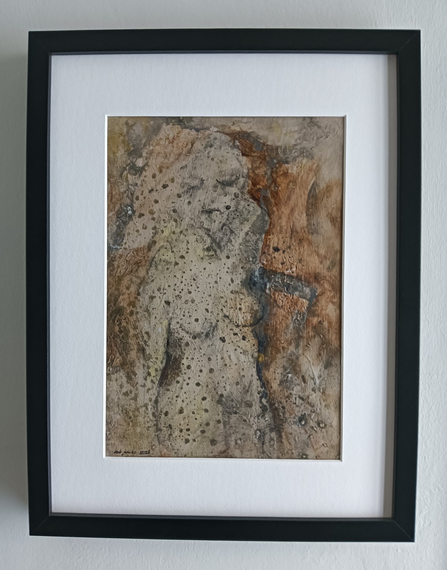 Dit ingelijst werk is gemaakt met acryl verf, stift en houtskool op een canvas doek. De afmeting is 42 x 32 cm en is 3,5 cm dik (dit is inclusief passe partout en zwarte lijst). Het werk zelf is 29 x 20 cm. Gedateerd en hand gesigneerd in 2026. Rechtstreeks uit het atelier in Weert (NL).