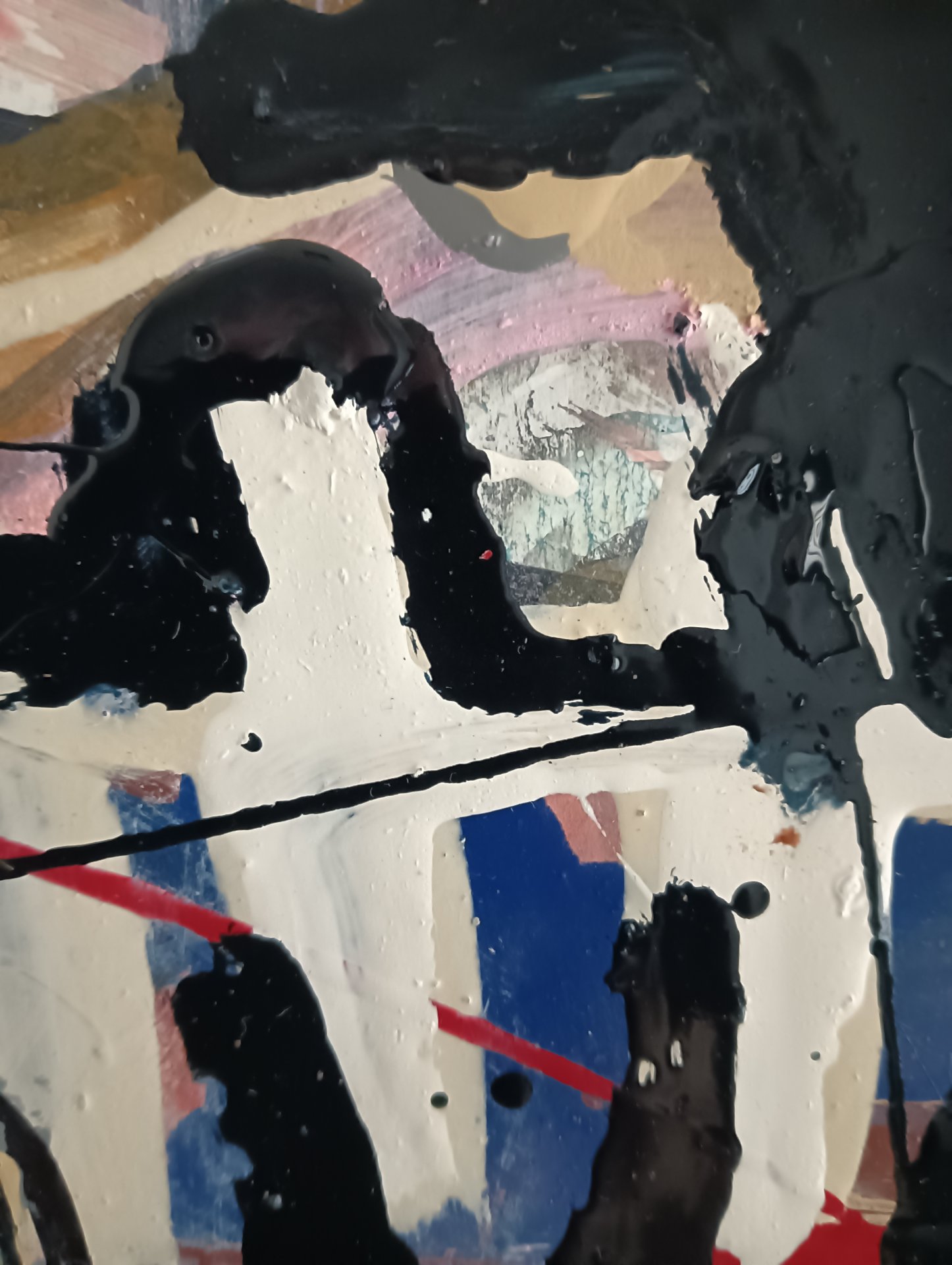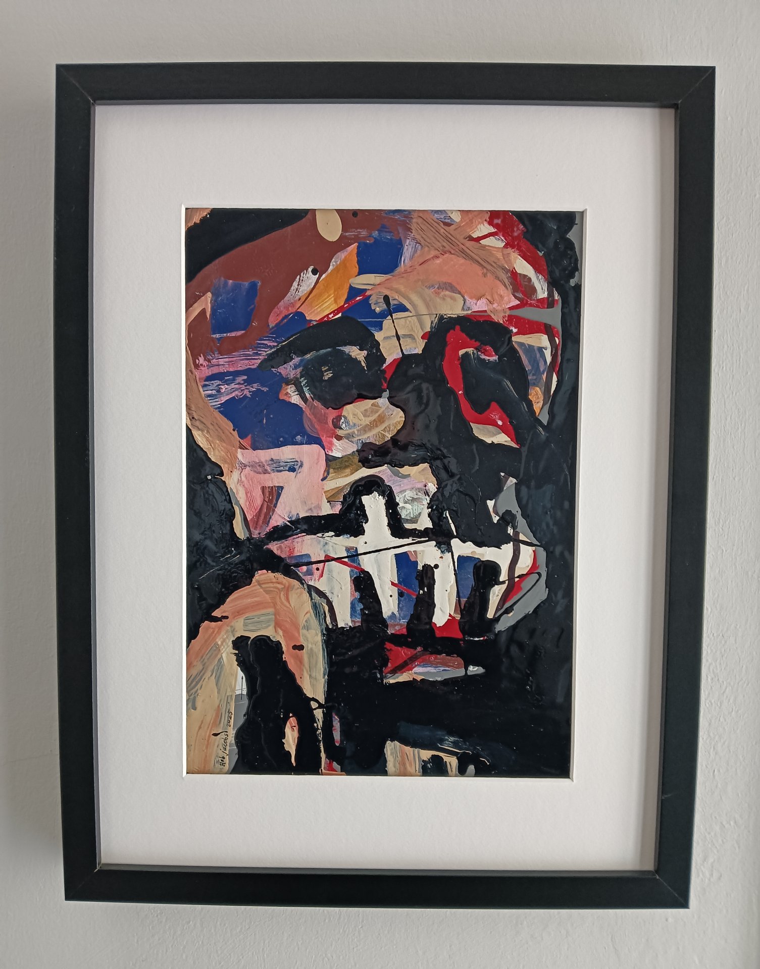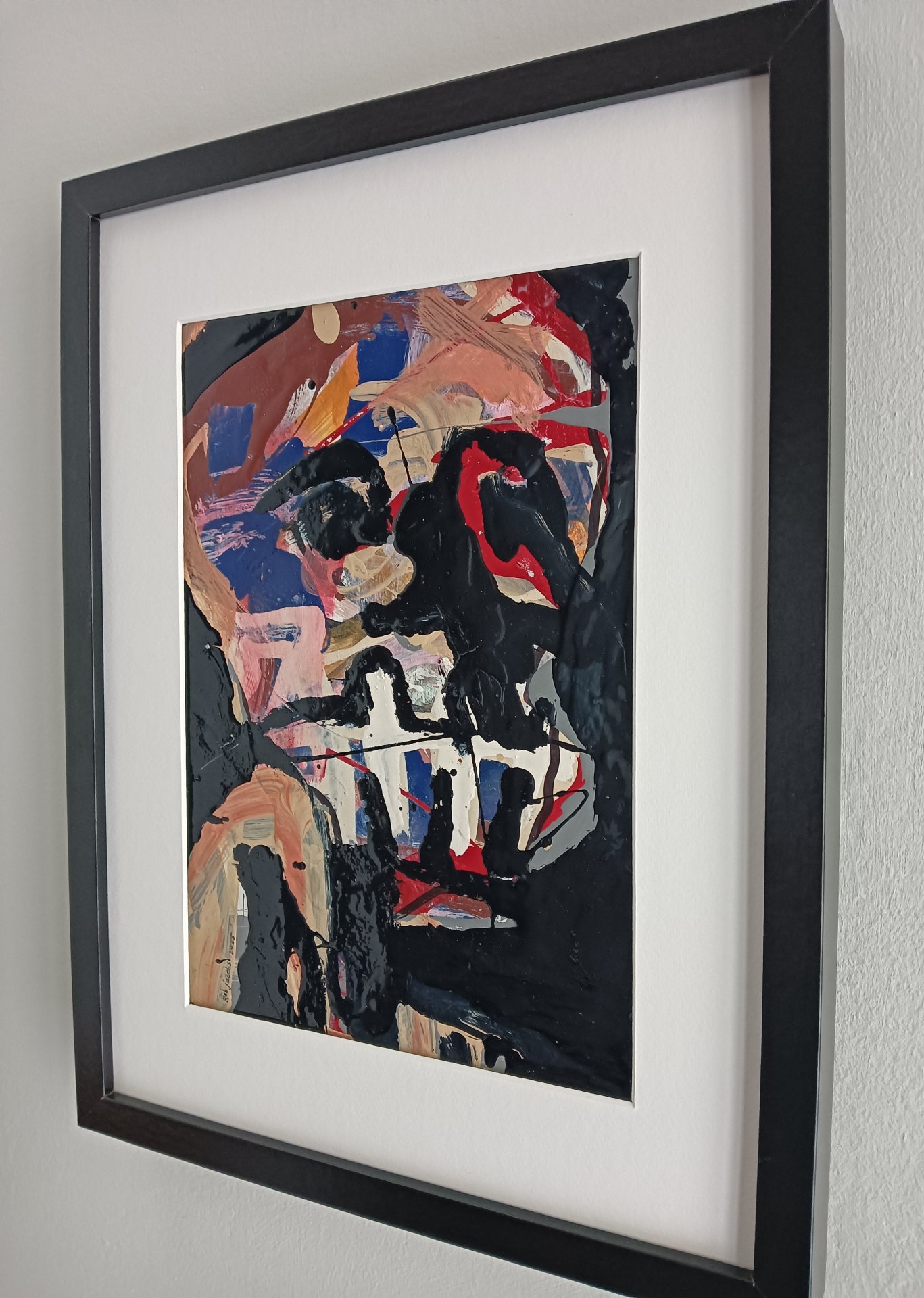Dit ingelijst expressief werk is gemaakt met acryl verf en lakverf op karton. De afmeting is 42 x 32 cm en is 3,5 cm dik (dit is inclusief passe partout en zwarte lijst). Het werk zelf is 29 x 20 cm. Gedateerd en hand gesigneerd in 2025. Rechtstreeks uit het atelier in Weert (NL).