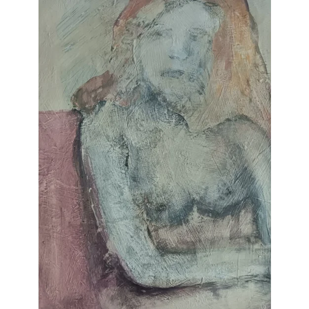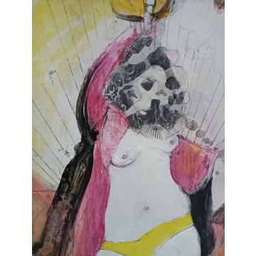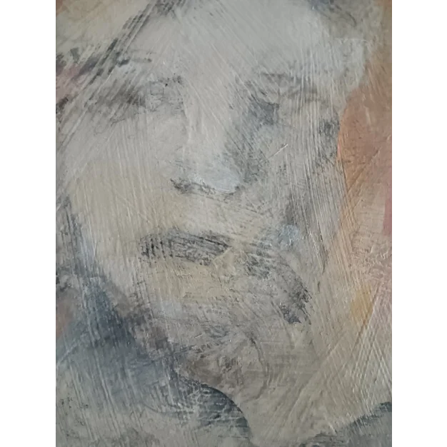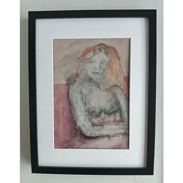 Dit ingelijst werk is gemaakt met acryl verf en houtskool op karton. De afmeting is 42 x 32 cm en is 3,5 cm dik ( dit is inclusief passe partout en zwarte lijst). Het werk zelf is 29 x 20 cm. Rechtstreeks uit het atelier in Weert (NL).