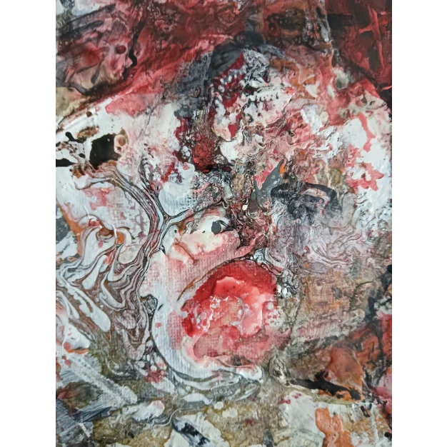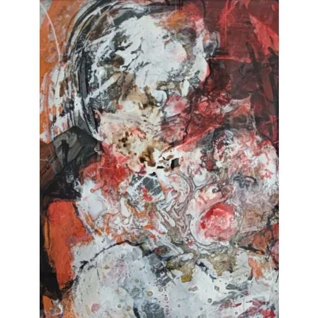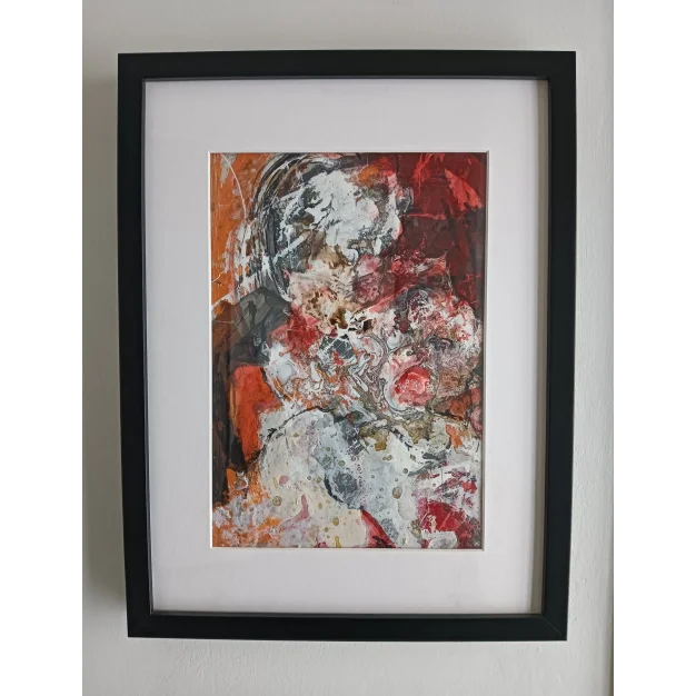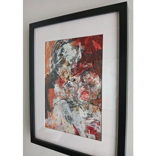 Dit ingelijst werk is gemaakt met acryl verf, lakverf, stift en houtskool op een canvas doek. De afmeting is 42 x 32 cm en is 3,5 cm dik (dit is inclusief passe partout en zwarte lijst). Het werk zelf is 29 x 20 cm. Rechtstreeks uit het atelier in Weert (NL).