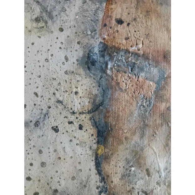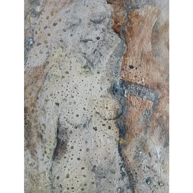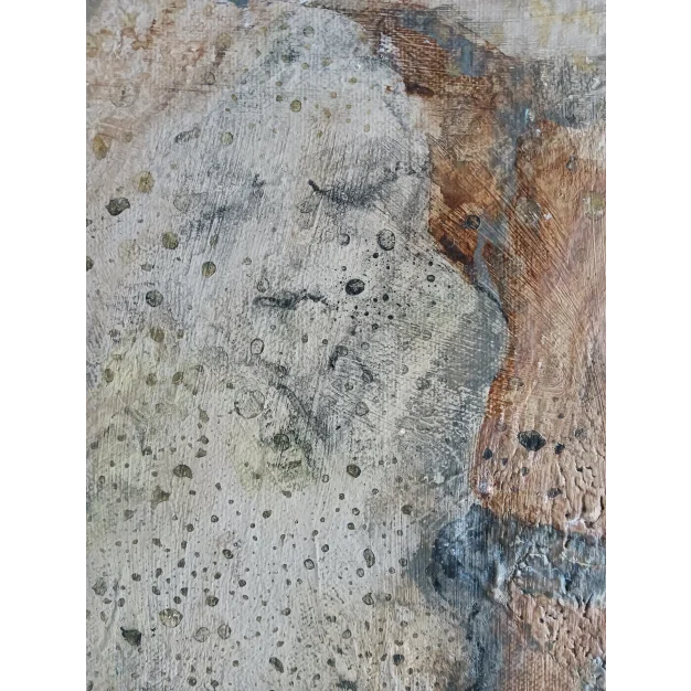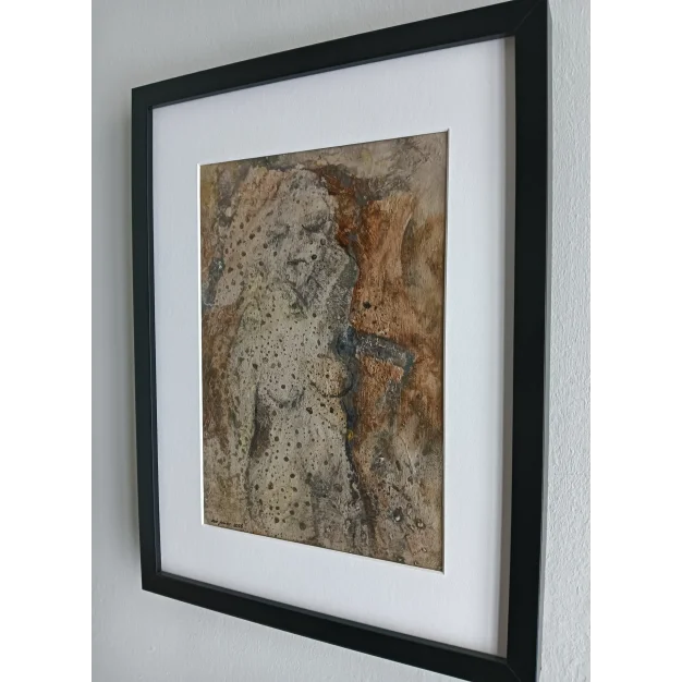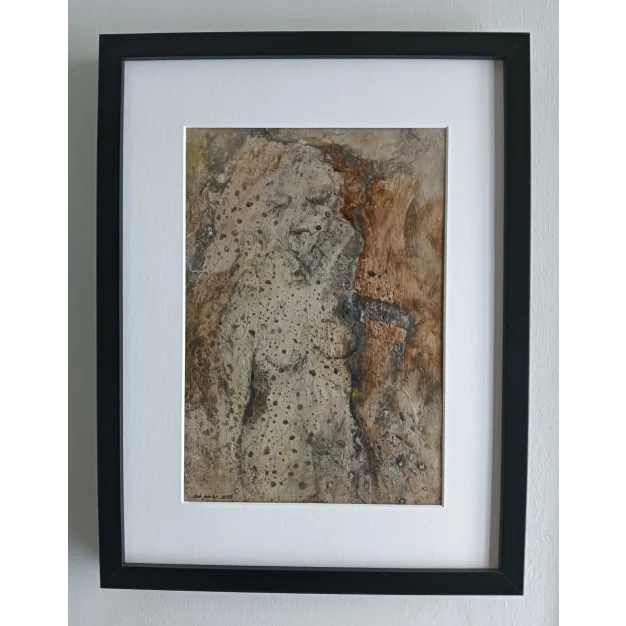 Dit ingelijst werk is gemaakt met acryl verf, stift en houtskool op een canvas doek. De afmeting is 42 x 32 cm en is 3,5 cm dik (dit is inclusief passe partout en zwarte lijst). Het werk zelf is 29 x 20 cm. Gedateerd en hand gesigneerd in 2026. Rechtstreeks uit het atelier in Weert (NL).