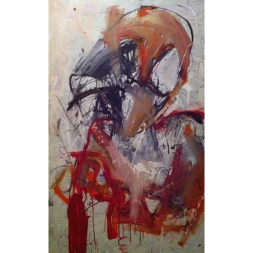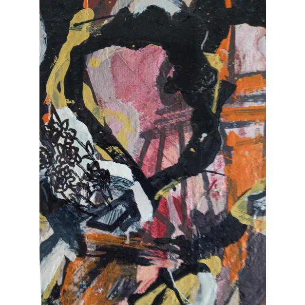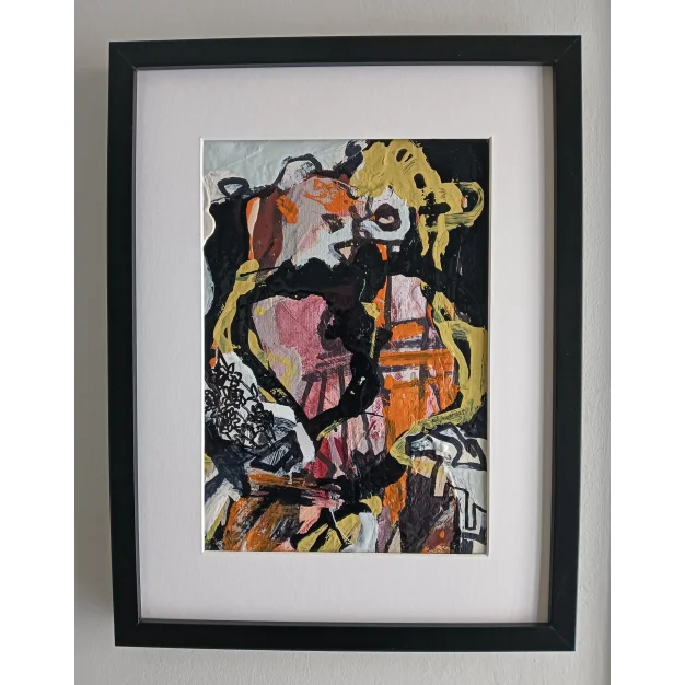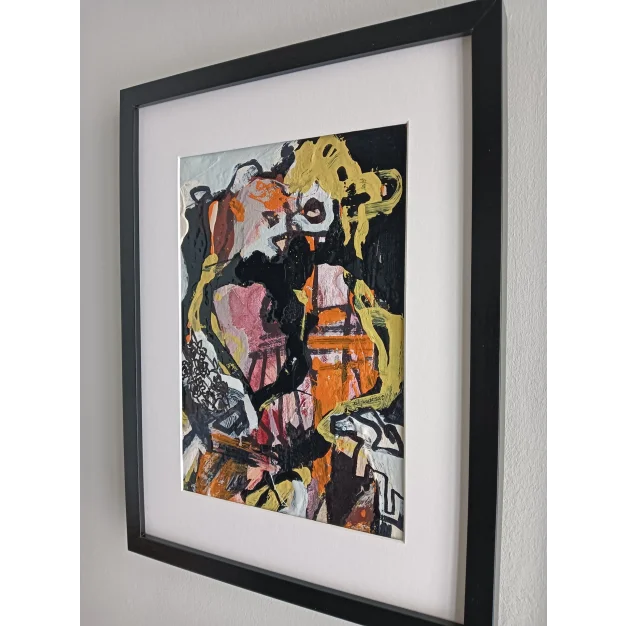 Dit ingelijst werk is gemaakt met acryl verf, lakverf, stift en houtskool op een linnen doek. De afmeting is 42 x 32 cm en is 3,5 cm dik (dit is inclusief passe partout en zwarte lijst). Gedateerd en hand gesigneerd in 2025. Rechtstreeks uit het atelier in Weert (NL).