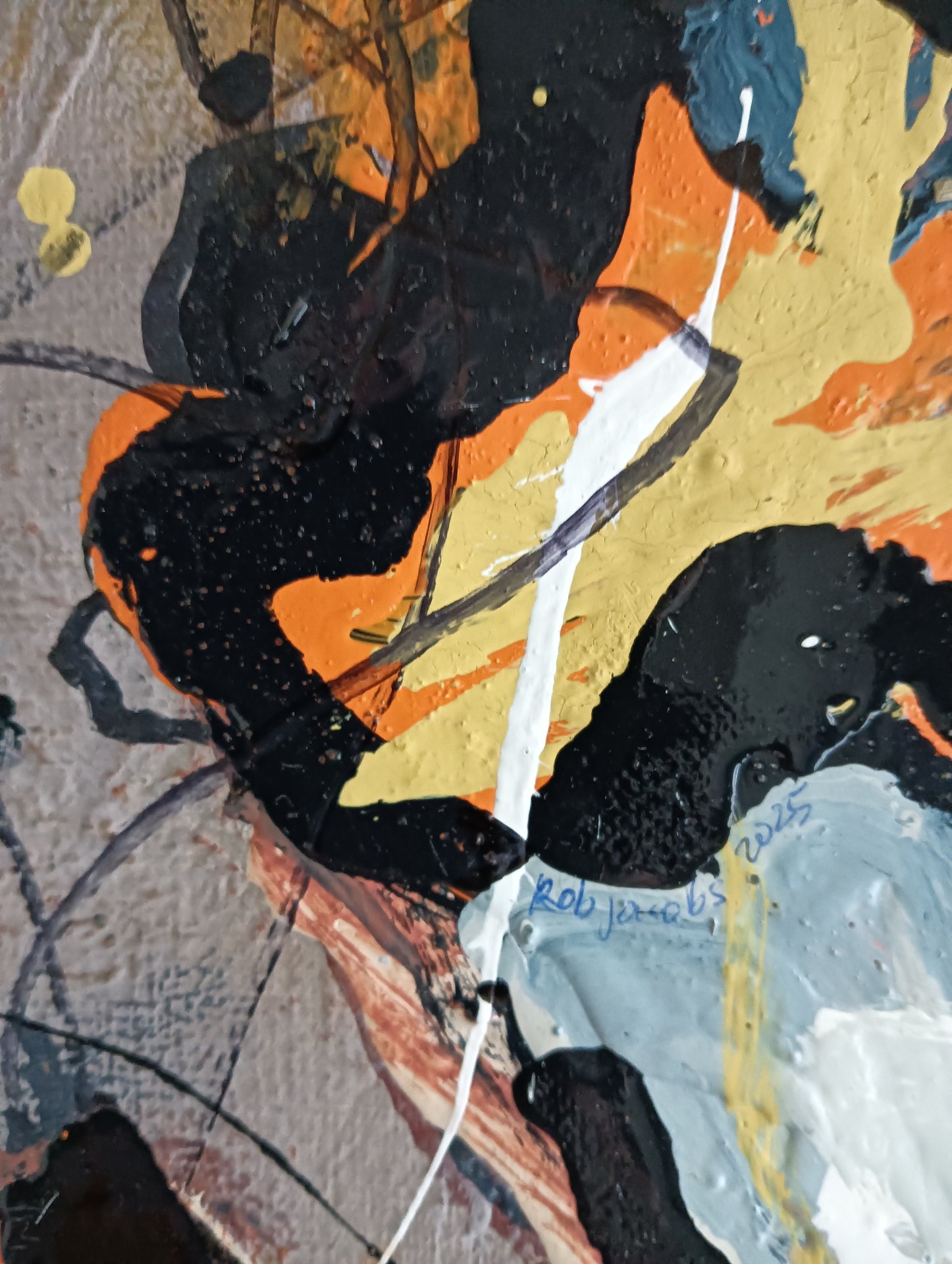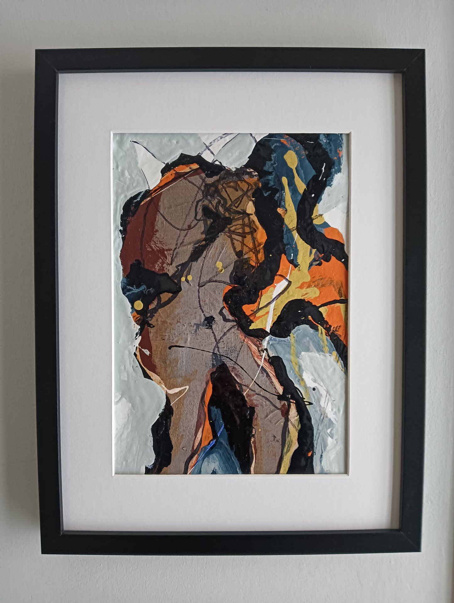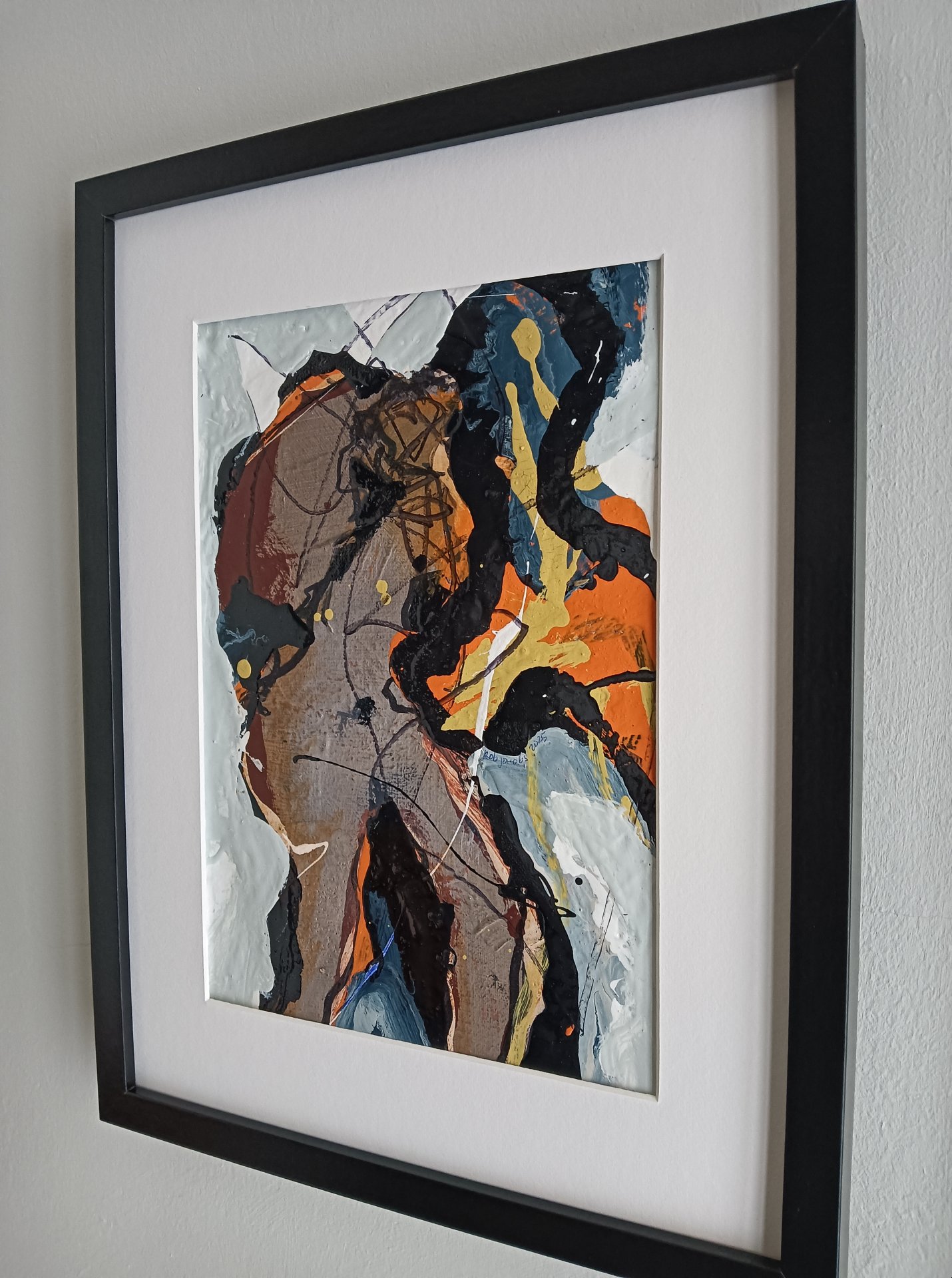 Dit ingelijst werk is gemaakt met acryl verf. lakverf, stift en houtskool op een linnen doek. De afmeting is 42 x 32 cm en is 3,5 cm dik (dit is inclusief passe partout en zwarte lijst). Het werk zelf is 29 x 20 cm. Rechtstreeks uit het atelier in Weert (NL).
